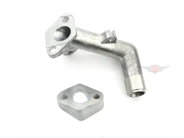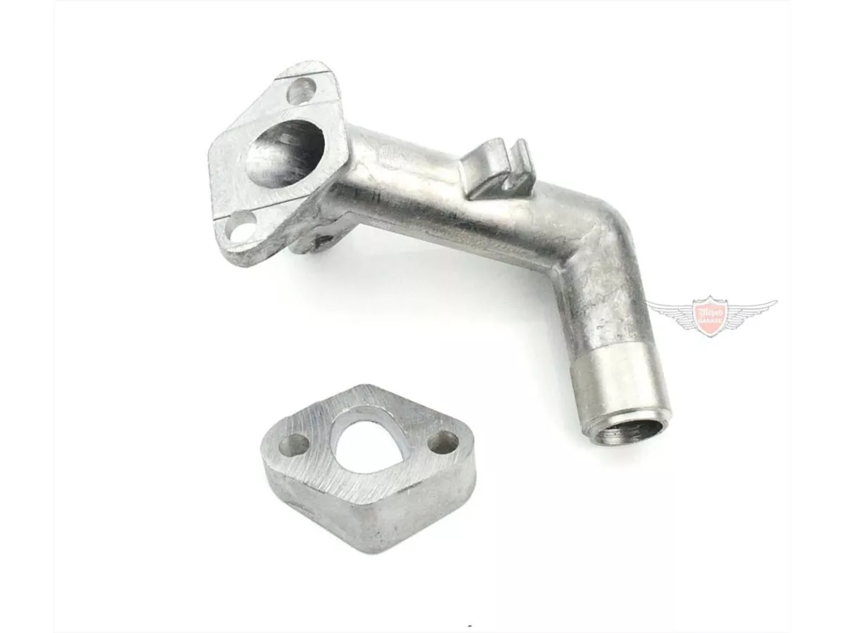 14mm Tuning Ansaugstutzen mit schrägem Anschluss und Adapterplatte, passend für Sachs 504 / 505 Motoren, verbaut bei Hercules Prima, M, DKW, KTM Mofa, Moped, Mokick. Vergaser Anschluss ca. 20mm, Vergleichsnummer 0267 114 399.