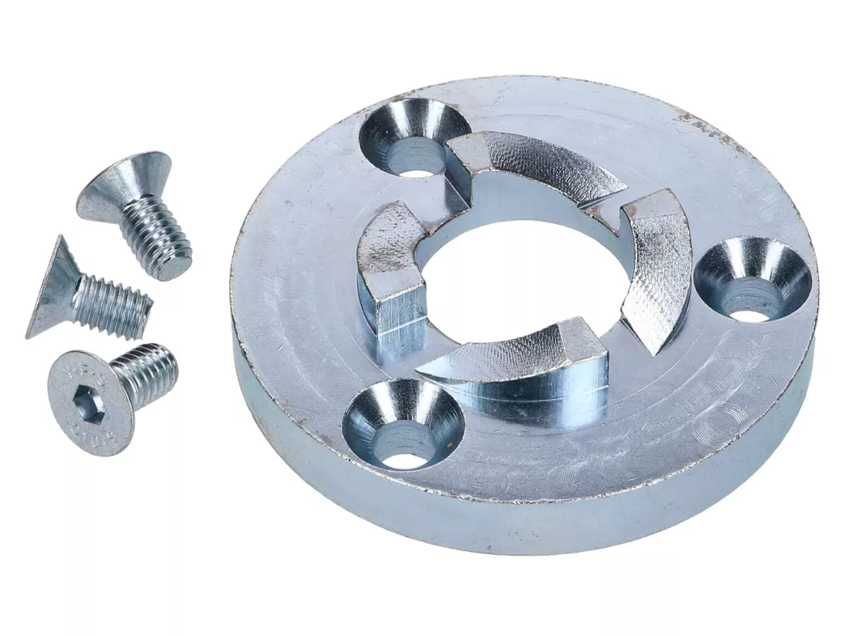 Das Ritzel besteht aus blau verzinktem Stahl. Dieser Adapter zum Pull-Starter ist vierfach verzahnt. Lieferung inklusive drei M6x12mm Senkkopfschrauben mit Innensechskant-Antrieb und 10.9 Festigkeit.