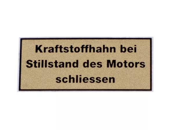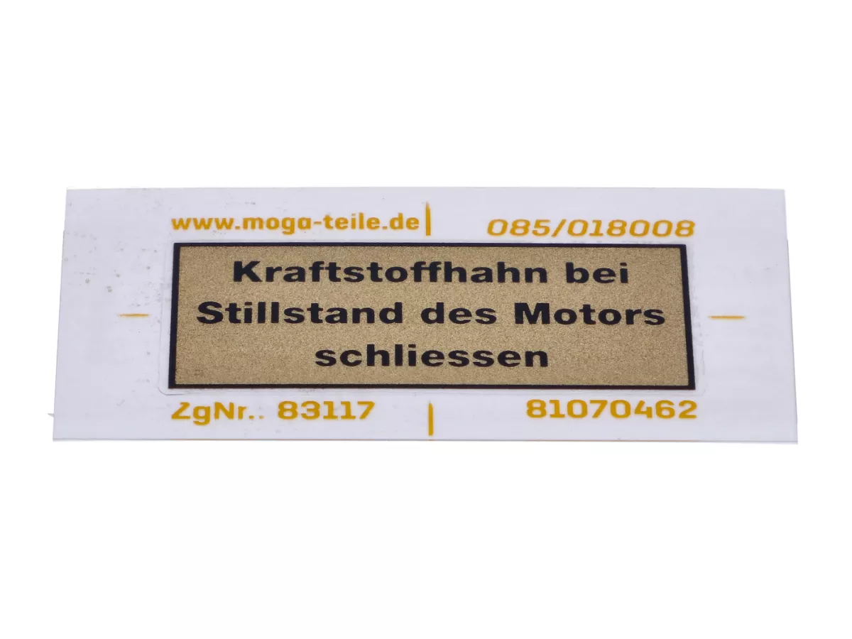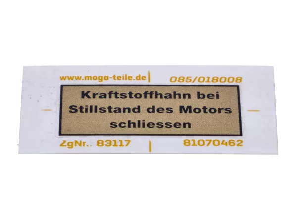Aufkleber mit der Aufschrift "Kraftstoffhahn bei Stillstand des Motors schließen" von MOGA für den Tank passend für Zündapp KS 50 Sport, Combinette, GTS, C50, ZR, R, M, Bergsteiger, ZD, ZL, ZS, ZX, 442 und 444 sowie Kreidler Florett, Flory, MF, MP, Hercules Prima M, MK, K, KX, Ultra, 220, HR, SB, Puch Maxi, Monza, Belmondo, X, MS, VS, DS, KTM, DKW Rixe und Sachs.