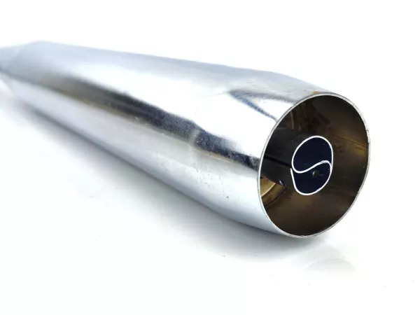 Steckflöten Tuning Auspuff einteilig mit 1-fach gebogenem Krümmer, Durchmesser 70mm, 32mm Krümmeranschluss, sehr gute Qualität der Fa. Jamarcol. Passend für Zündapp GTS 50, C 50 Sport, CS 50, Typen 517, 529, 448. Auch geeignet für Tuning von CS 25, ZD und viele andere Modelle, jedoch im Bereich der StVZO nicht zugelassen.