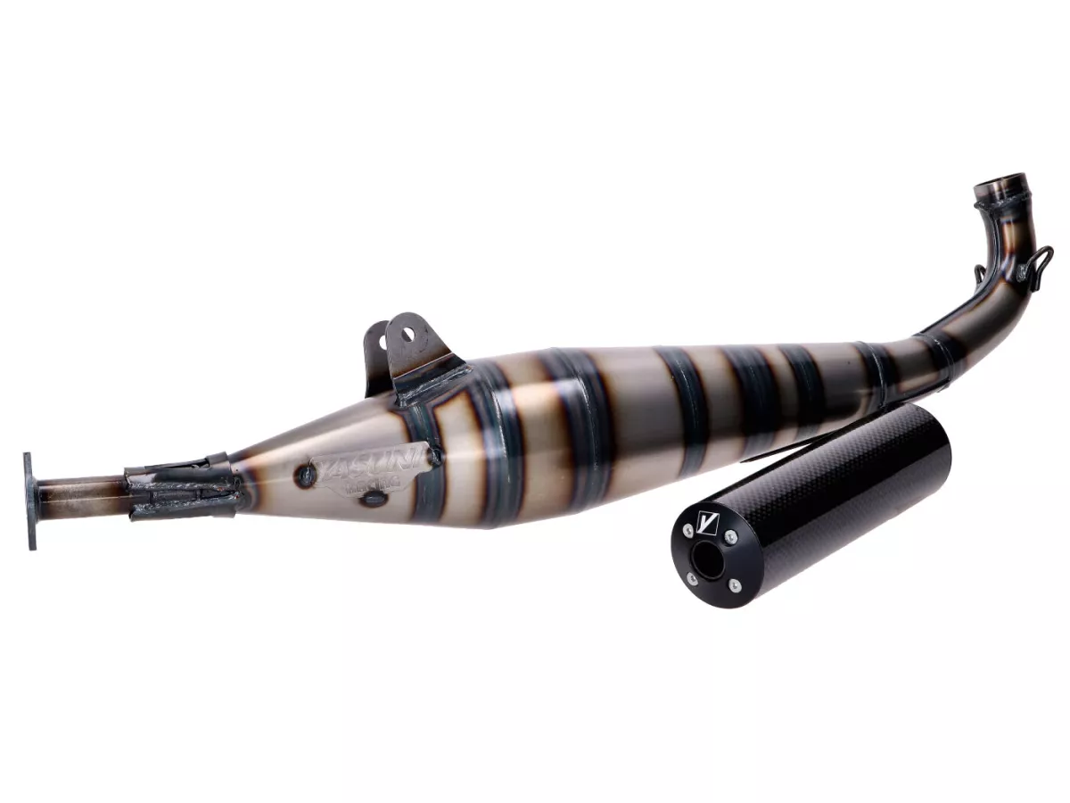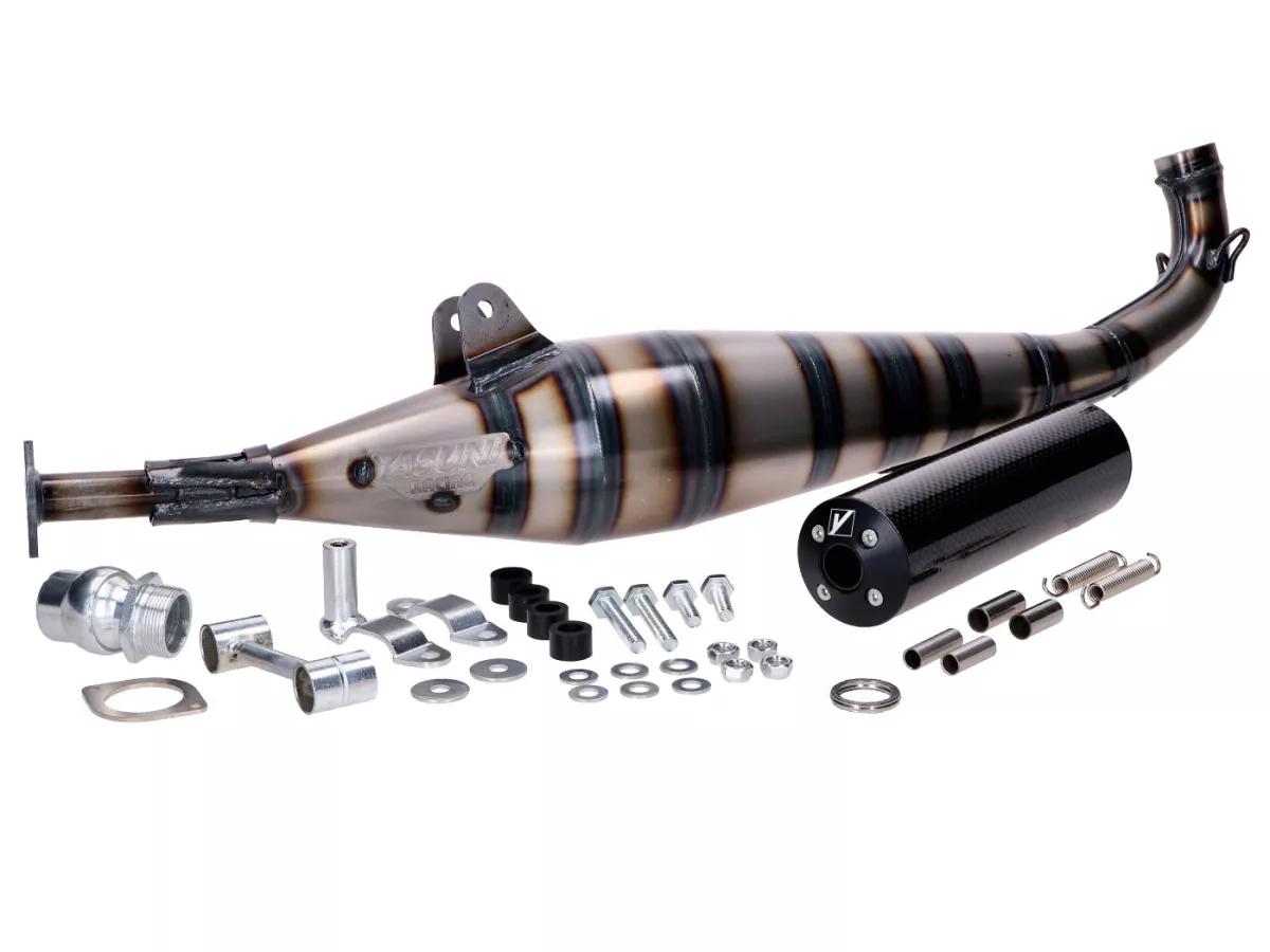 Sportauspuffanlage von Yasuni mit Endschalldämpfer aus Aluminium mit Carbon-Finish passend für Peugeot 103 SP und Vogue Mofas. Geeignet für 50-70ccm Zylinder.