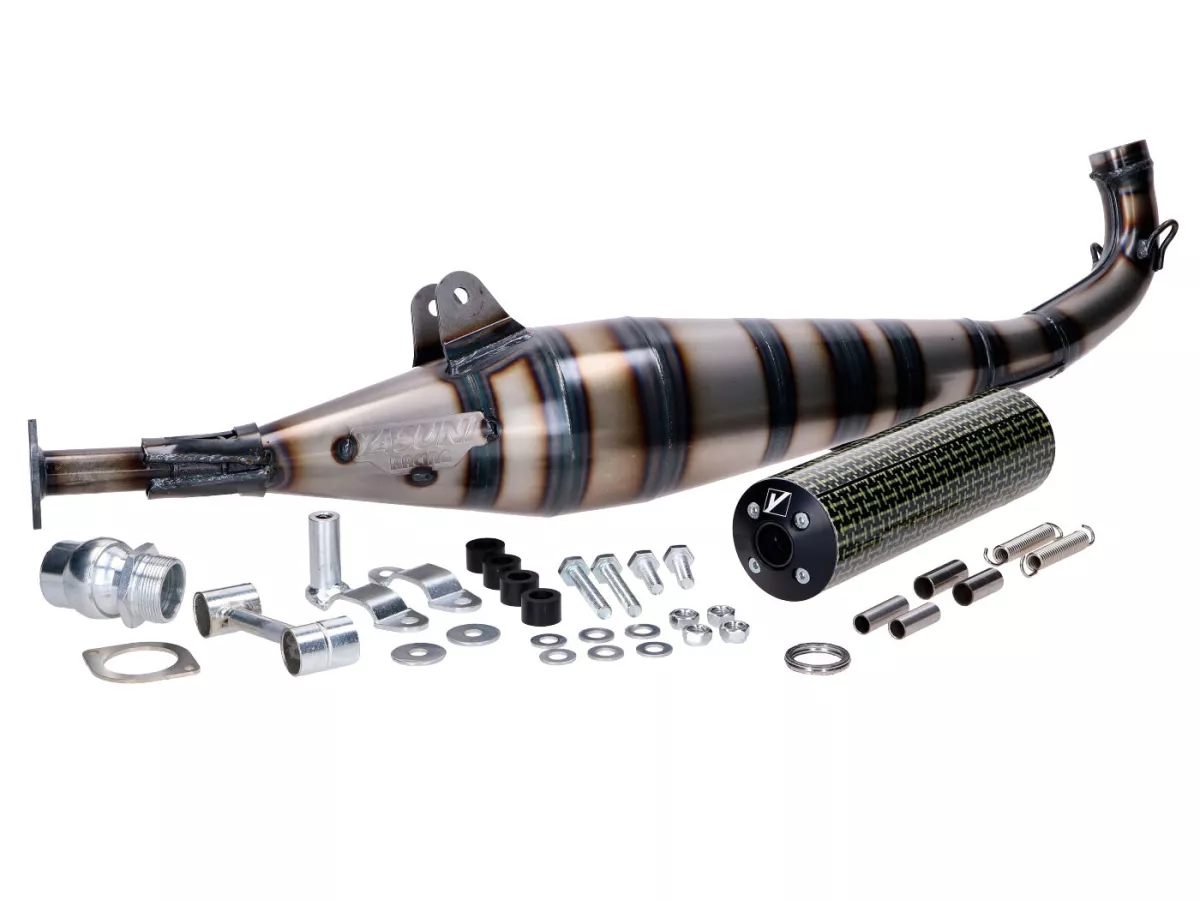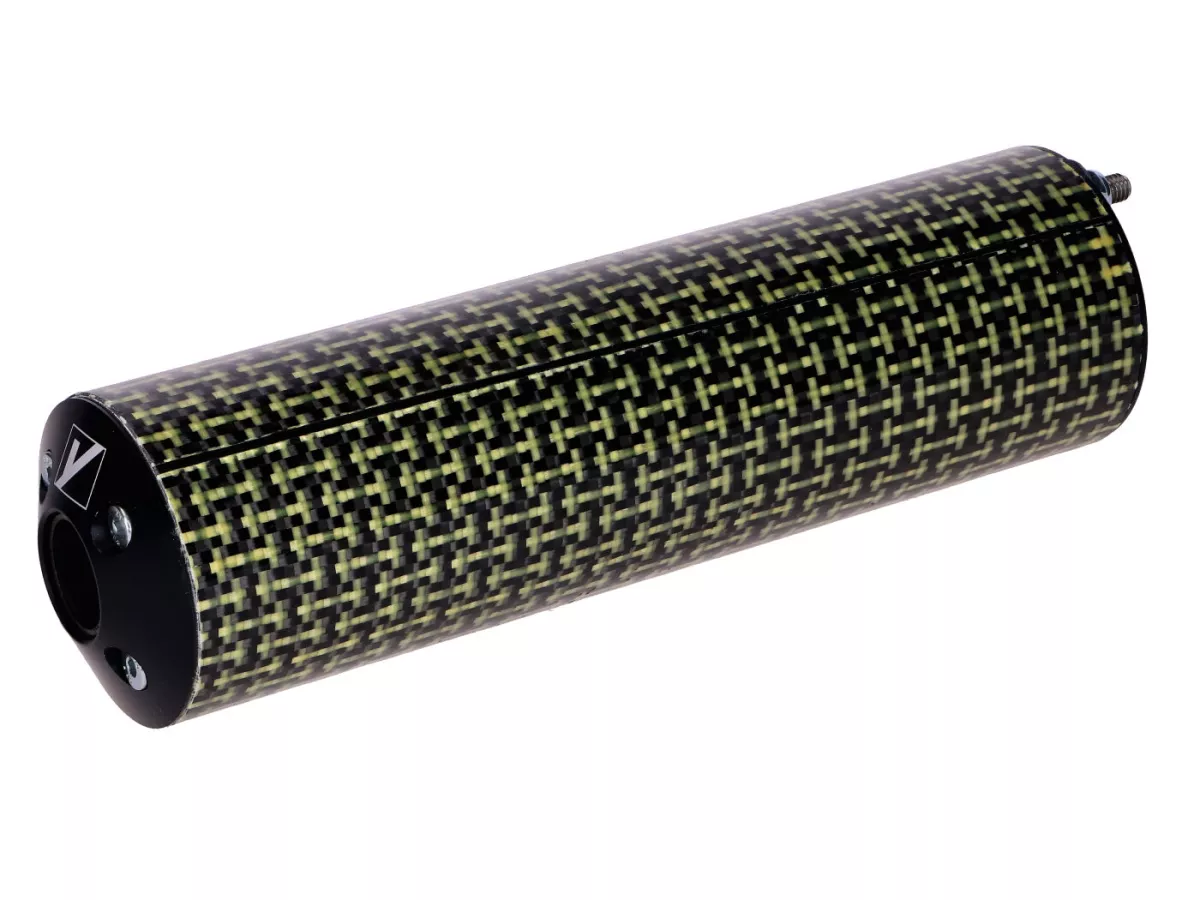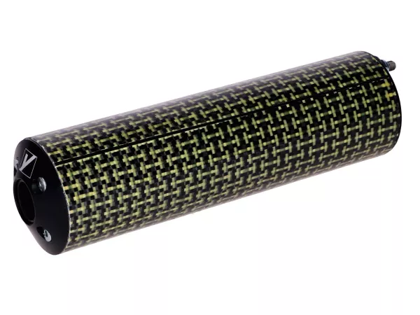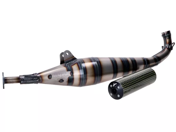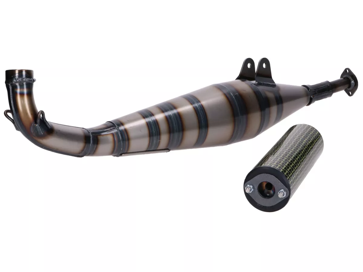 Sportauspuffanlage von Yasuni mit Endschalldämpfer aus Aluminium mit Carbon-Kevlar-Finish passend für Peugeot 103 SP und Vogue Mofas. Geeignet für 50-70ccm Zylinder.