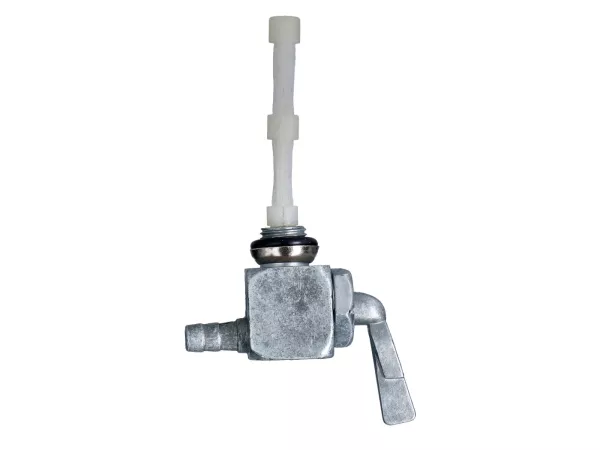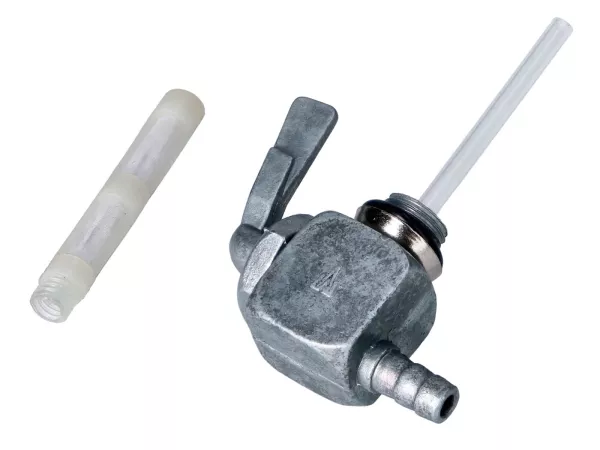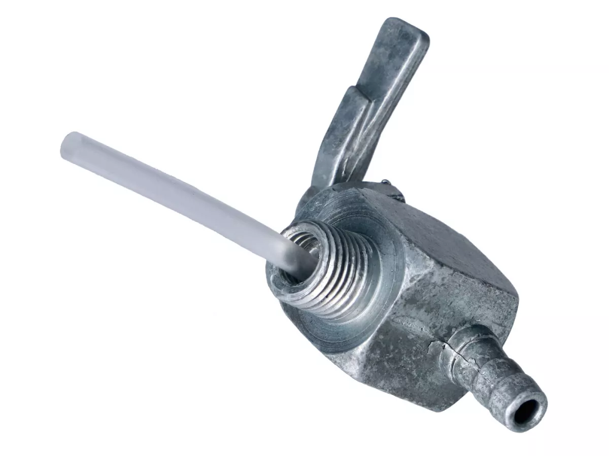 Manueller Benzinhahn für Tomos A3 und A35 Mofas zum Einschrauben in den Tank. Oftmals führt eine Fehlfunktion dieses Bauteils zu Startschwierigkeiten und Motoraussetzern während der Fahrt. Die Filter des Benzinhahnes sind kaputt oder der Durchlauf bereits verstopft und der Benzinhahn gibt den Kraftstoff nicht oder nur in unzureichendem Maße frei. Zur Behebung trägt nur der komplette Austausch bei.