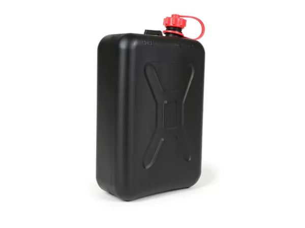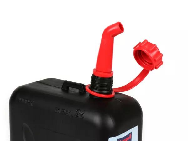 Kraftstoff-Kanister STANDARD 2 Liter. Material: HD-PE in schwarz, mit integrierter Auslauftülle für Benzin und Diesel.