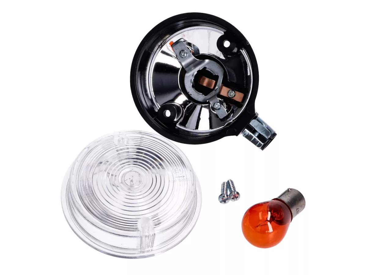 80mm (Durchmesser) Blinker mit transparentem Blinkerglas und schwarzer Endkappe. Hinten passend für Simson Moped bzw. Enduro S50, S51, S70 sowie SR50, SR80 Simson Motorroller. Lieferung inklusive Leuchtmittel in Orange.