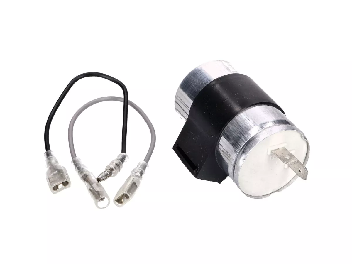Blinkrelais mit 2-Pin Stecksockel und Haltegummi. 6 Volt für 2 Blinker mit 10 Watt und einer Kontrollleuchte mit 3,4 Watt.