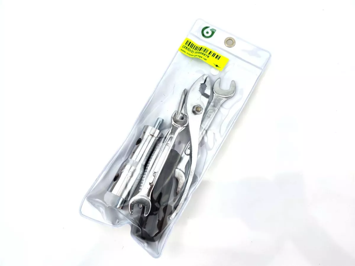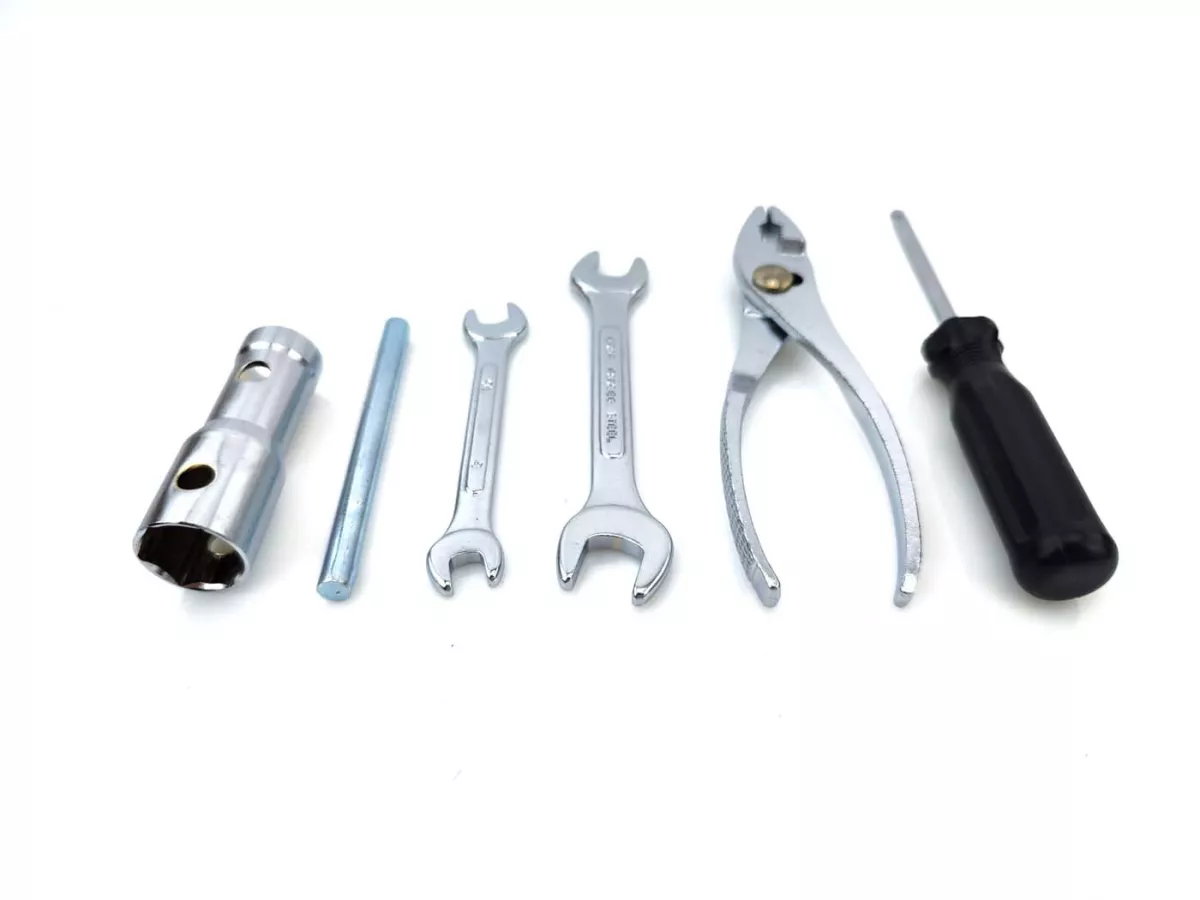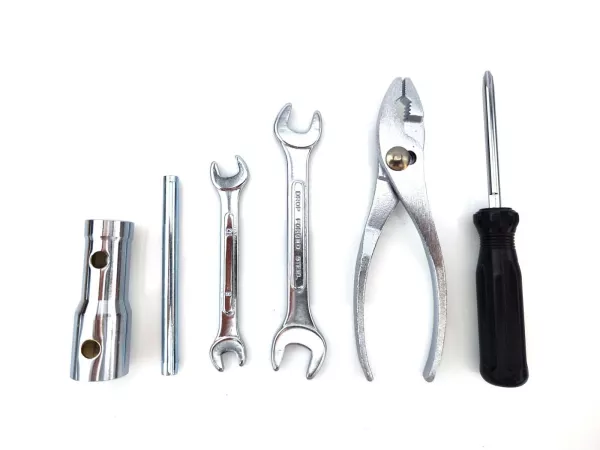 6-tlg. Bordwerkzeug-Set, inkl. Schlitz/Kreuzschlitz Schraubendreher, Zündkerzenschlüssel 21/18 m. Drehrohr, verstellbare Zange, Gabelschlüssel 12/24 & 8/10. Passend für Mofa, Moped, Mokick, Roller, z.B. Zündapp, Kreidler, Hercules, Puch, Simson, DKW, KTM, Miele.