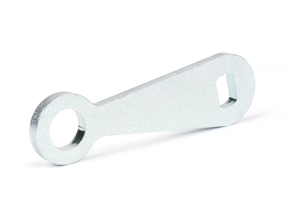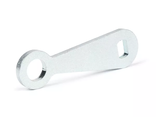 Der sogenannte Bremsarm sitzt auf der Bremsnocke. Er wandelt die geradlinige Zugbewegung des Bremszuges in eine Drehbewegung um.