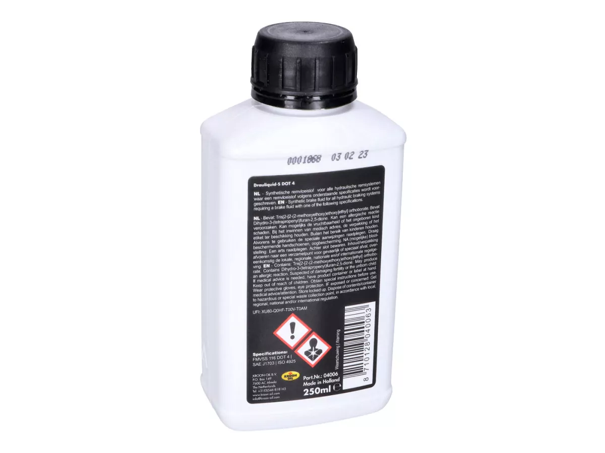 Bremsflüssigkeit Drauliquid S DOT 4 von Kroon Oil für alle hydraulischen Bremssysteme mit Trommel- oder Scheibenbremsen. Diese synthetische Bremsflüssigkeit ist korrosionshemmend und hat einen niedrigen Fließpunkt. Sie ist nicht schädlich für Dichtungen und erfüllt die folgenden Standards: