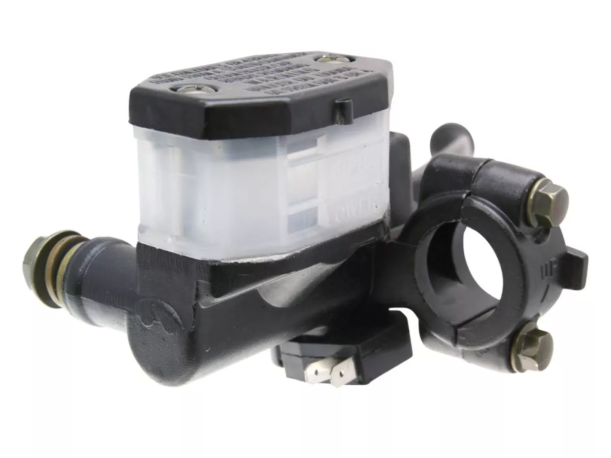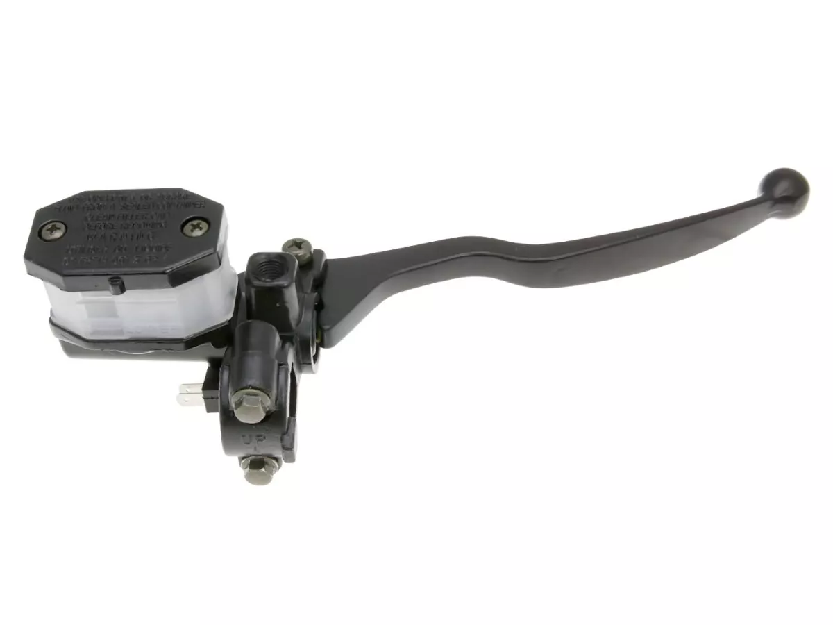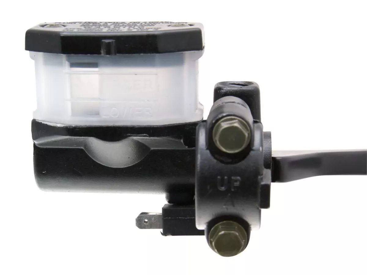 Universaler 12mm Handbremszylinder für die vordere Scheibenbremse. Die komplette Armatur wird inklusive Bremshebel geliefert und ist mit einem Bremslichtschalter ausgestattet. Der Bremszylinder eignet sich hervorragend für Lenkerumbauten und/oder als alternatives Ersatzteil, wenn der originale Bremszylinder z. B. den Restwert des Fahrzeuges übersteigt oder gar nicht mehr erhältlich ist.