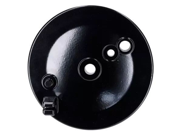 Schwarzes Bremsschild mit Bohrung für den Bremskontakt, hinten passend für Simson S50, S51, S70, KR51 Schwalbe, SR4-1 Spatz, SR4-2 Star, SR4-3 Sperber, SR4-4 Habicht.