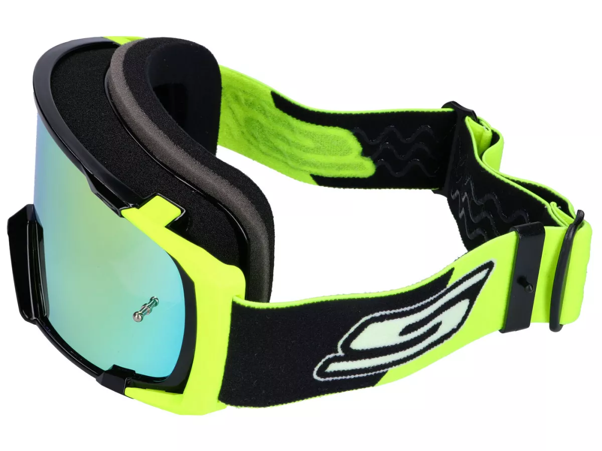 S-Line Scrub Motocross-Brille mit Brillenrahmen in der Farbkombination Schwarz / Fluo-Gelb und verspiegeltem Brillenglas.