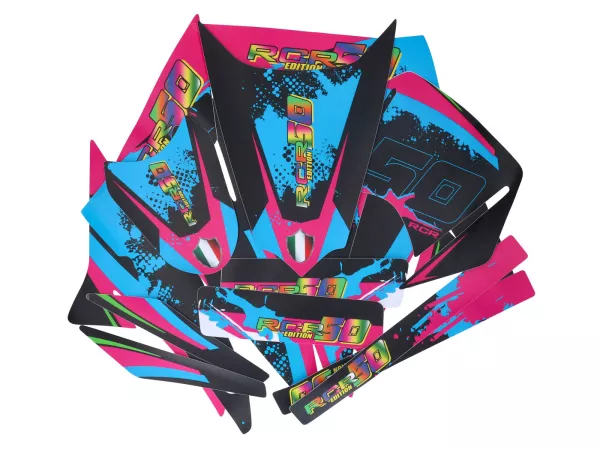 Absolut präzise geschnittenes Dekor in Schwarz-Pink-Blau matt. Made in Germany. Passend für Gilera RCR 50 Baujahr 2011-2017.