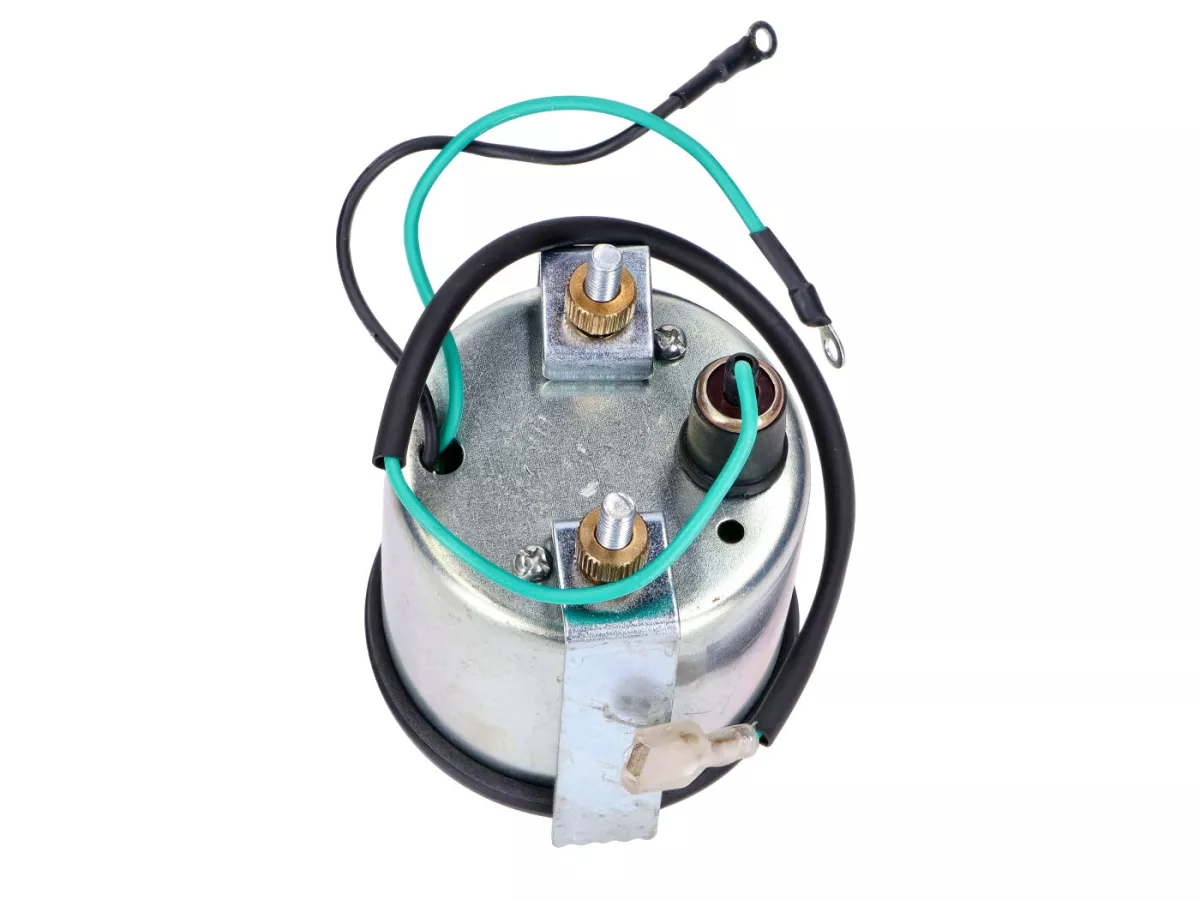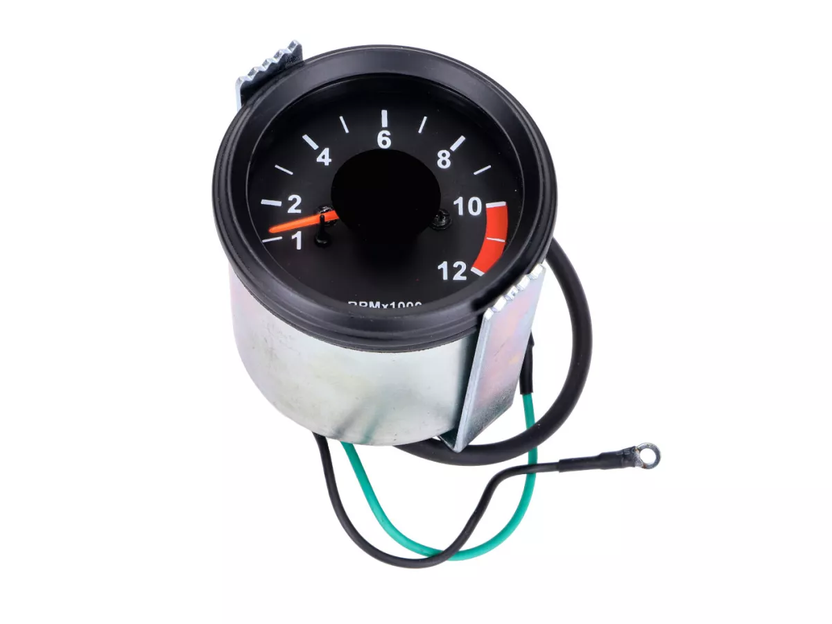 Runder Drehzahlmesser mit einem 60mm Durchmesser und schwarzer Scheibe / Ziffernblatt mit Anzeigebereich bis 12.000U/min passend für Casal K-190, Hercules K 50, Puch M50, Kreidler Florett, Zündapp C50 Sport und KS50 Super Sport mit den Modellbezeichnungen 517 und 529. Der Halter, Gummi und die Beleuchtung sind im Lieferumfang enthalten.