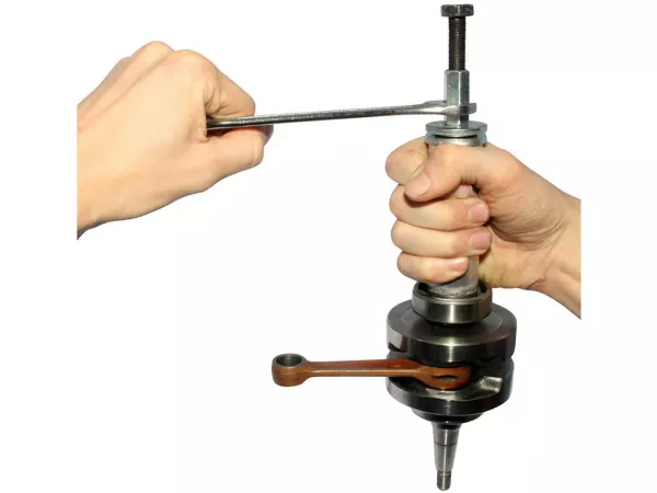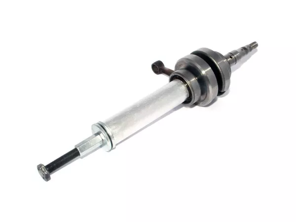 Dieses Spezialwerkzeug erleichtert die Montage neuer Kurbelwellenlager deutlich. Dieses Lager-Montagewerkzeug ist einfach zu verwenden: Die Spezialmutter wird auf die Kurbelwelle geschraubt, das passende Aluminiumrohr mit Schraube und Mutter, den beiliegenden Scheiben und einem Nadellager eingesetzt; durch Drehen der Druckmutter mit einem passenden Schraubenschlüssel wird das Lager allmählich auf die Kurbelwelle gedrückt, bis es den Anschlag erreicht.