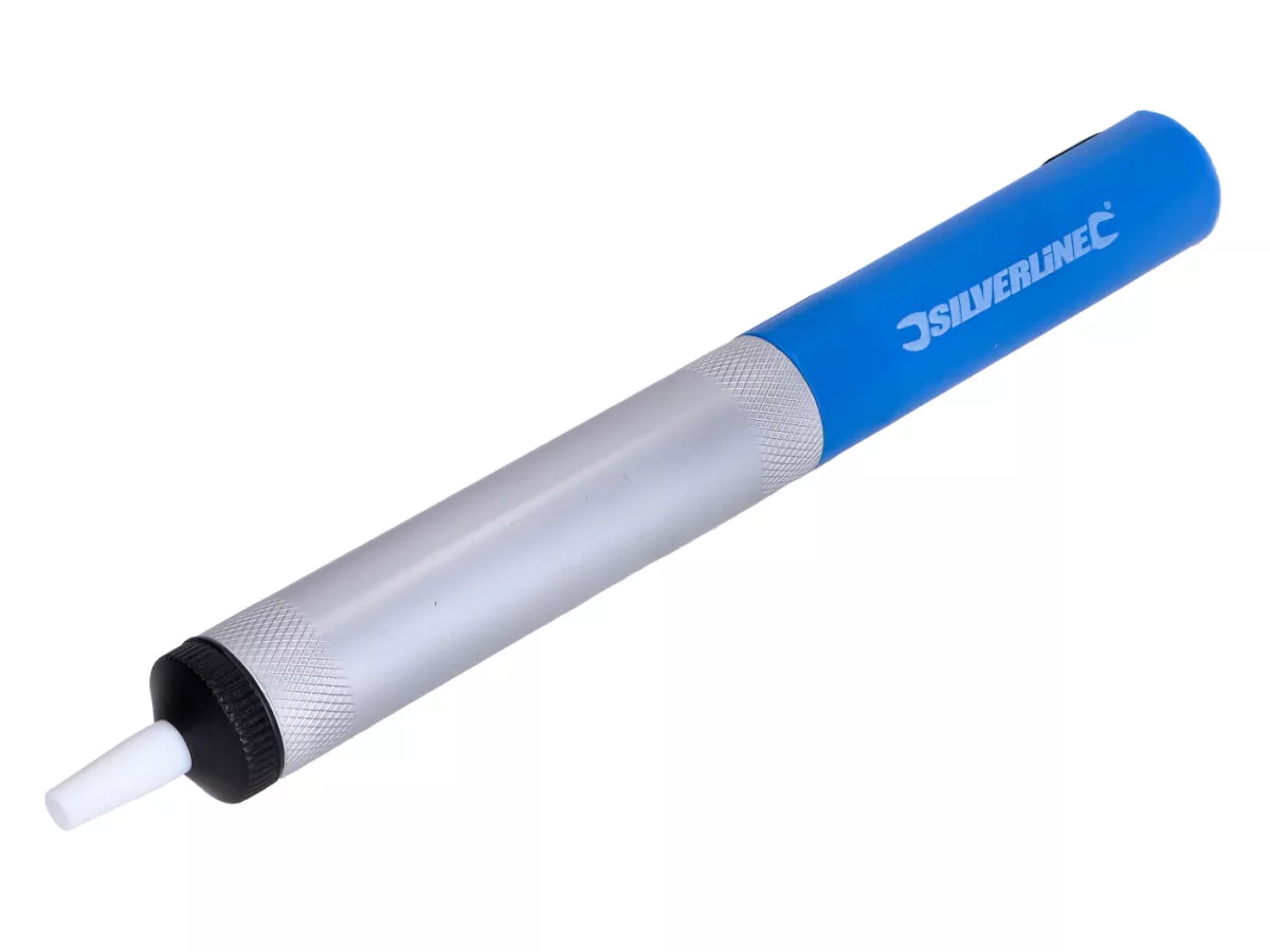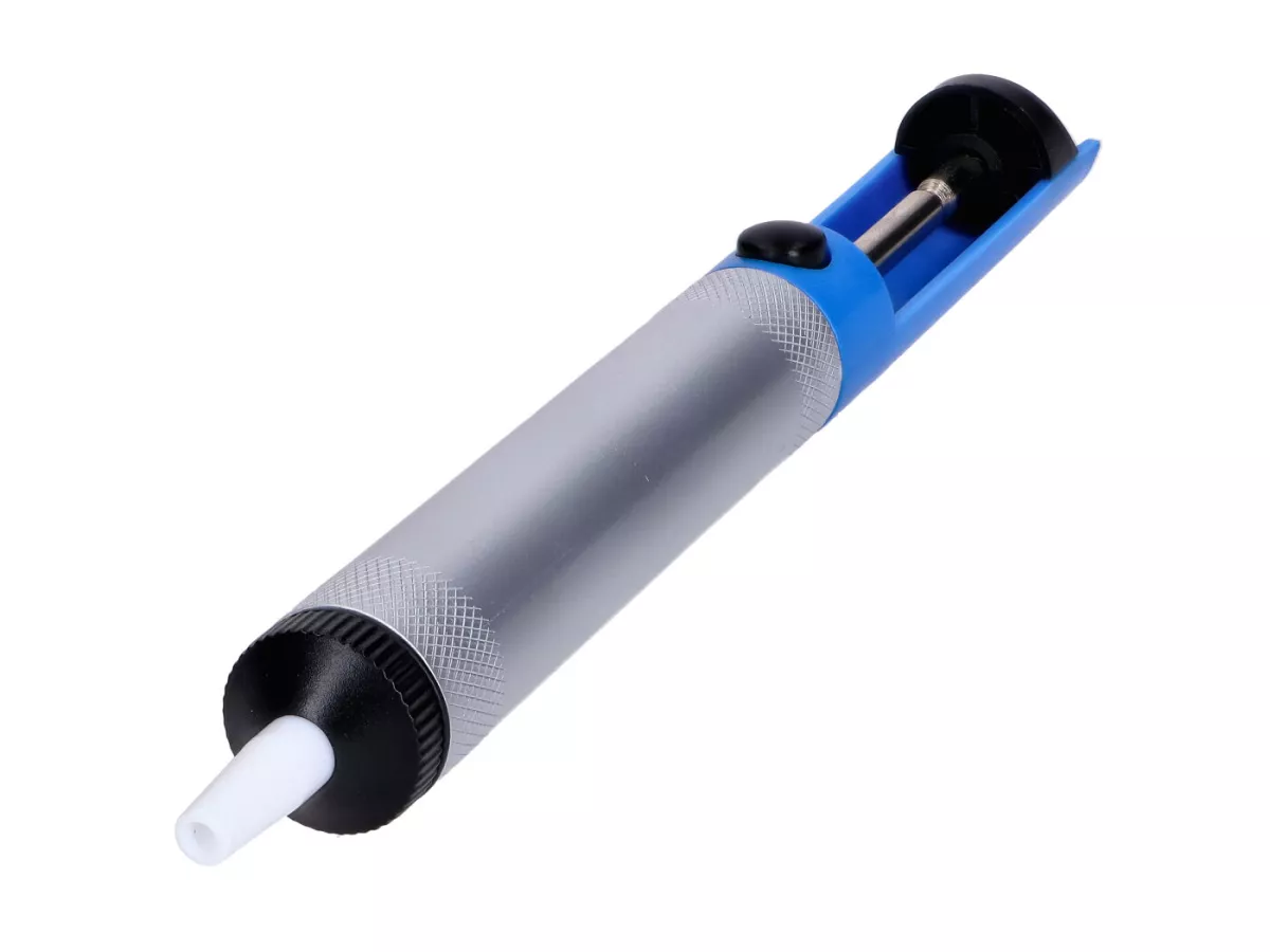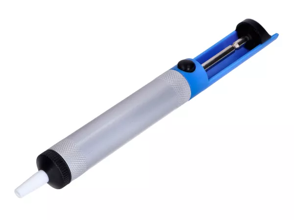 Eine Entlötpumpe mit einer antistatischen Entlötspitze zum Entfernen von überschüssigen, verflüssigtem Lötzinn.