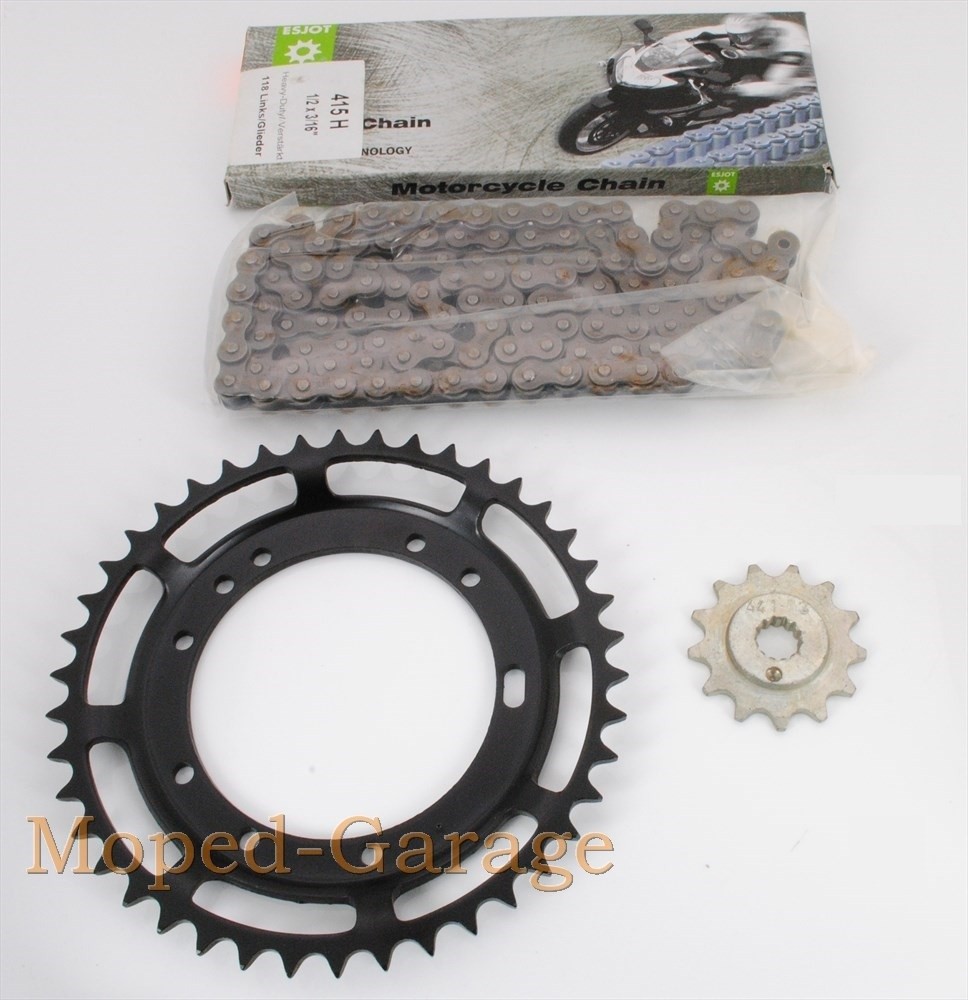Angeboten wird ein neuer originaler Kettensatz vom Erstausrüster Esjot also ALLE Teile von Esjot Ritzel, Kettenrad und Kette in Top Qualität passend bei Kreidler MF 2 Mofa mit Speichenfelge. mit folgender Übersetzung: 13 er Ritzel mit kleiner verzahnter Aufnahme 42 Kettenrad 106er Kette Made in Germany