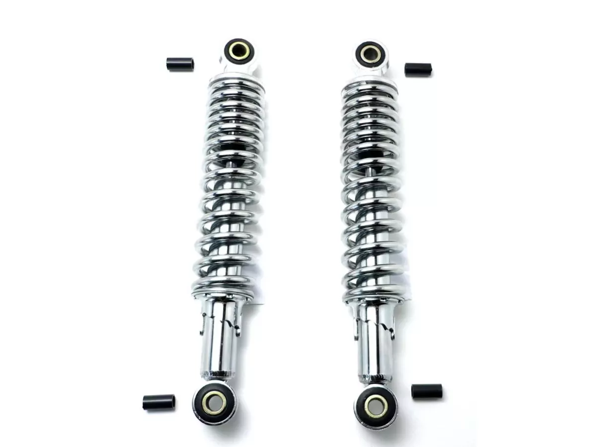 300mm Chrom Federbeine, 5-fach einstellbar, progressiv. Befestigungsbuchsen Ø 10mm, mit Adapter auf 8mm reduzierbar. Federdicke ca. 7mm, FederØ ca. 46mm. Länge Auge zu Auge. Passend für Kreidler, Zündapp, Hercules, Puch usw.