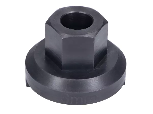 Schiebe den Freilauf-Entferner über die Radachse, sodass die beiden Stifte in die Nut im Freilauf greifen. Damit das Spezial-Werkzeug gegen den Freilauf drückt, drehe im nächsten Schritt die Radmutter auf die Radachse. Mithilfe eines Schraubenschlüssels lässt sich der Freilauf jetzt unkompliziert lockern. Zur vollständigen Demontage des Freilaufs muss die Radmutter wieder abgeschraubt werden.
