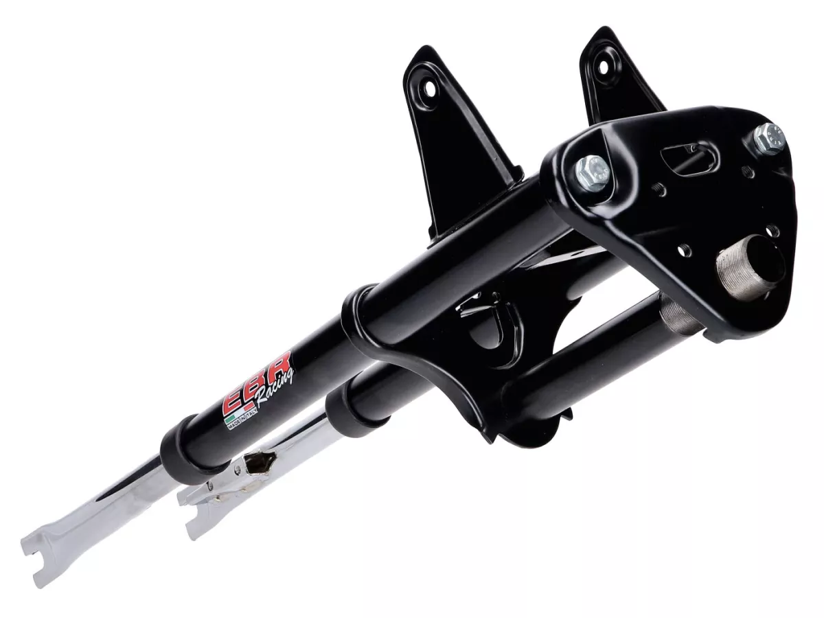 Telegabel von EBR in Schwarz passend für Puch Maxi. Es handelt sich um die Variante "Original" mit mechanischer Feder und Nylonbuchsen. Die Halterungen bestehen aus pressgeformtem Stahl.