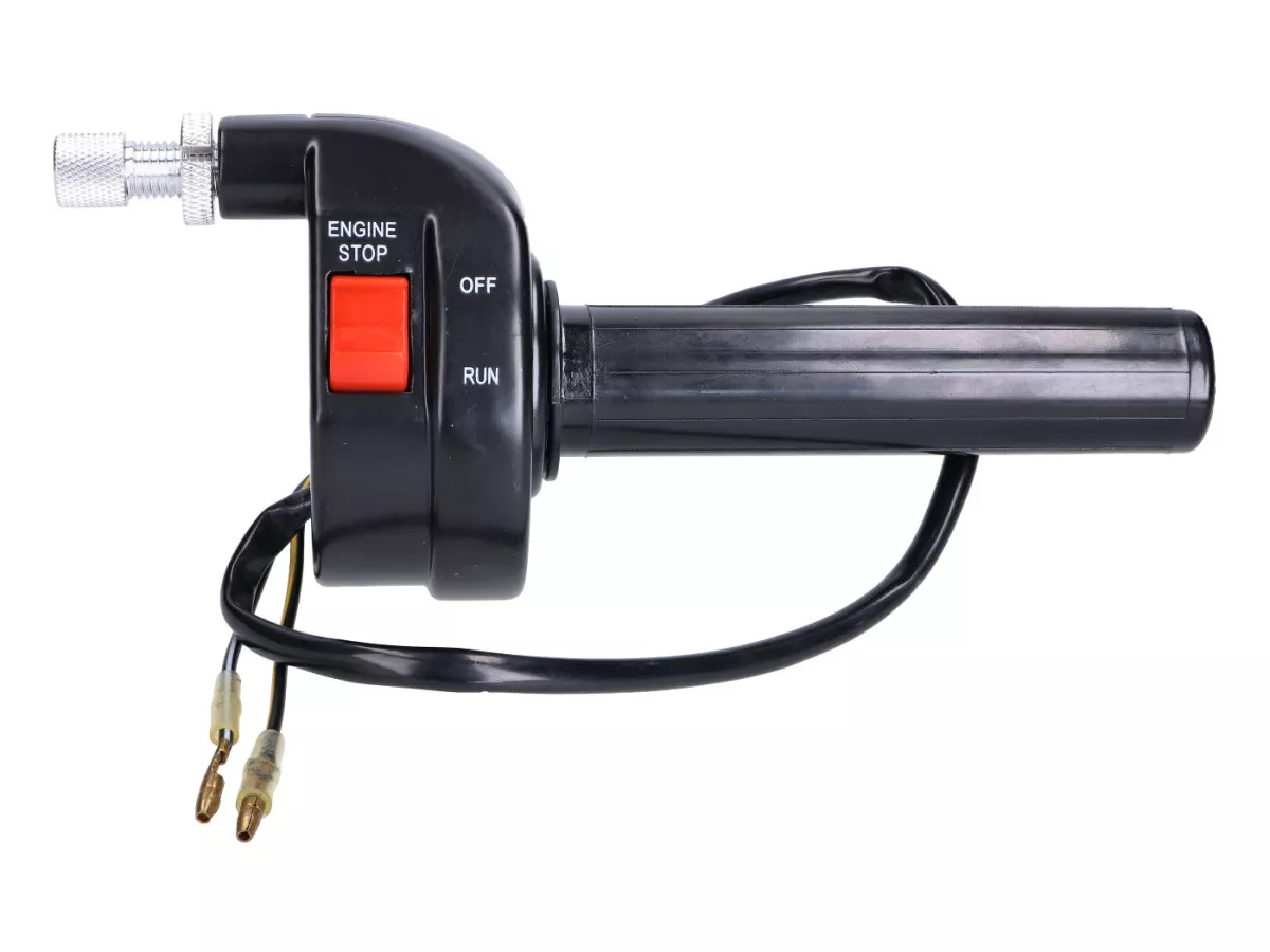 Universaler Drehgasgriff mit Motor Ein-/ Aus-Schalter (Killschalter/ Kill Switch). Ein passender Gaszug muss selbst gebaut werden. Hierzu empfehlen wir den von uns angebotenen universal einsetzbaren Bowdenzug.