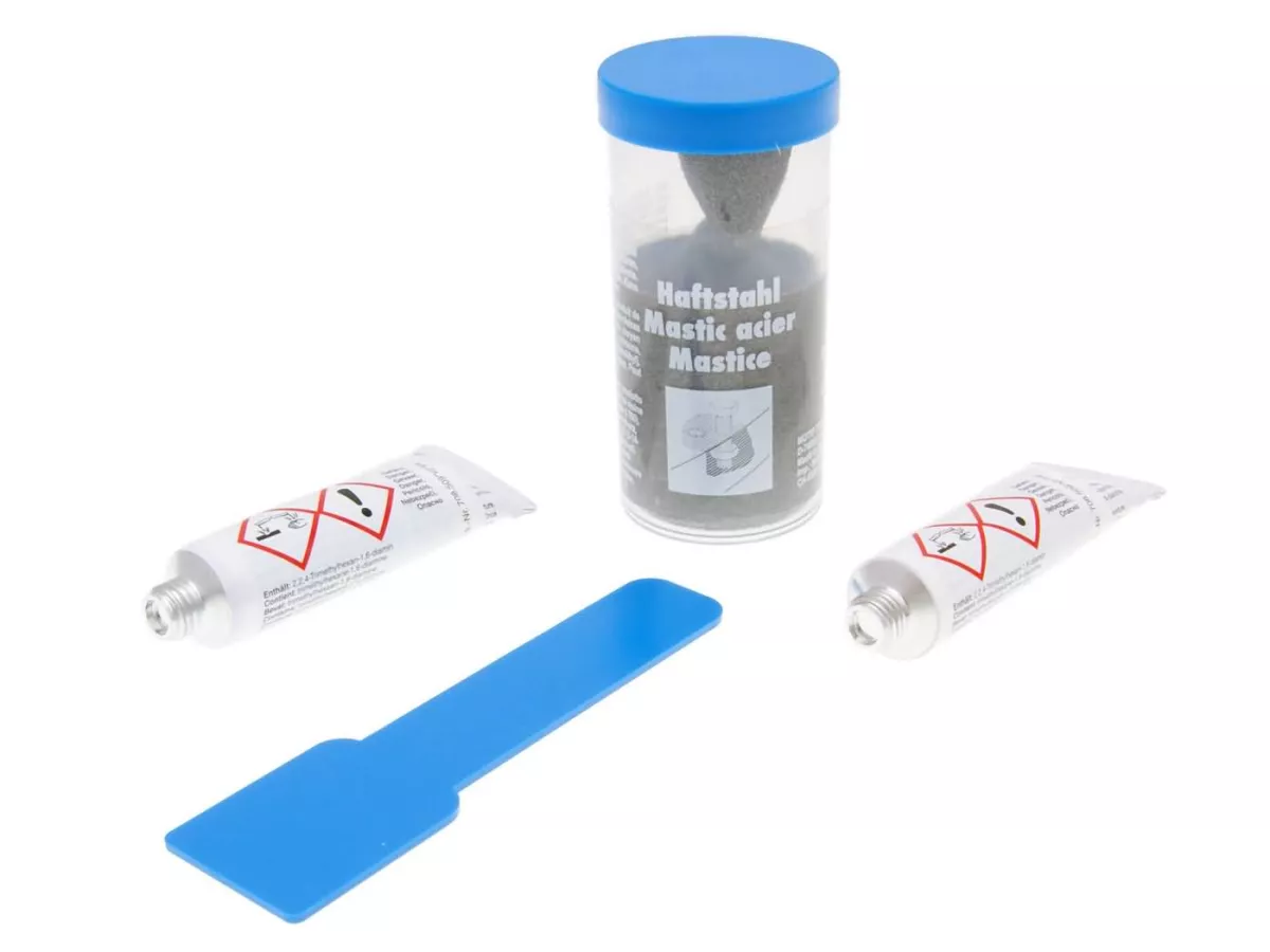 Zu verarbeiten wie Spachtelmasse, geeignet für alle Metalle, Gussteile, Holz, Eternit, Keramik und Beton.