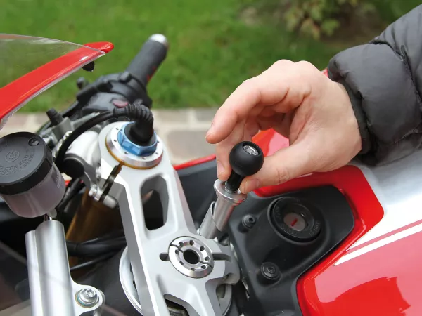 Lampa Opti Tube Handyhalterung zum Anschluss an der Lenksäule. Für Lenksäulen mit 15mm bis 17,2mm Durchmesser geeignet und gestattet die Benutzung und das Anzeigen vom Telefon sowohl vertikal als auch horizontal. Ideal für Motorrad bzw. Motorroller mit freiliegender Steuerkopfmutter.