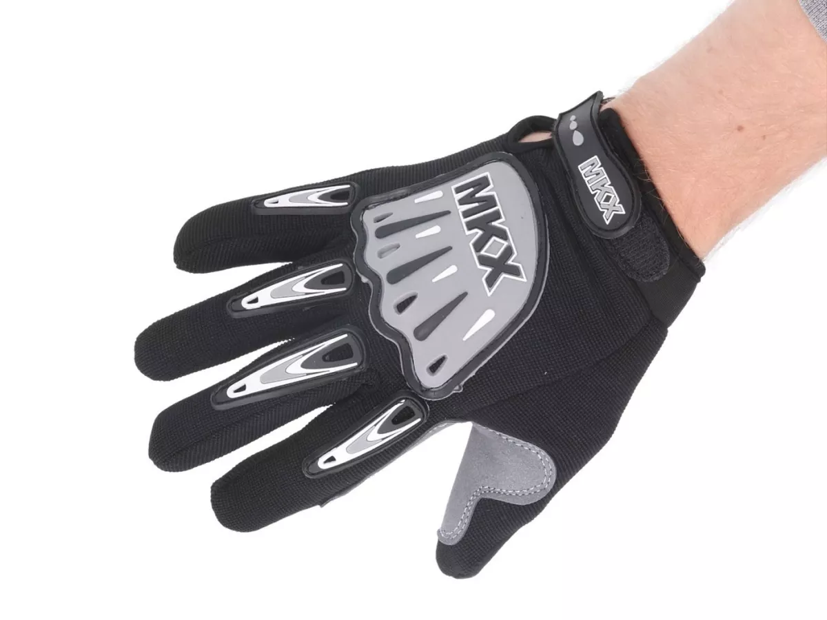 Enduro/ Cross Handschuhe mit Klettverschluss und Gummiprotektoren für Handrücken und Fingerknöchel.