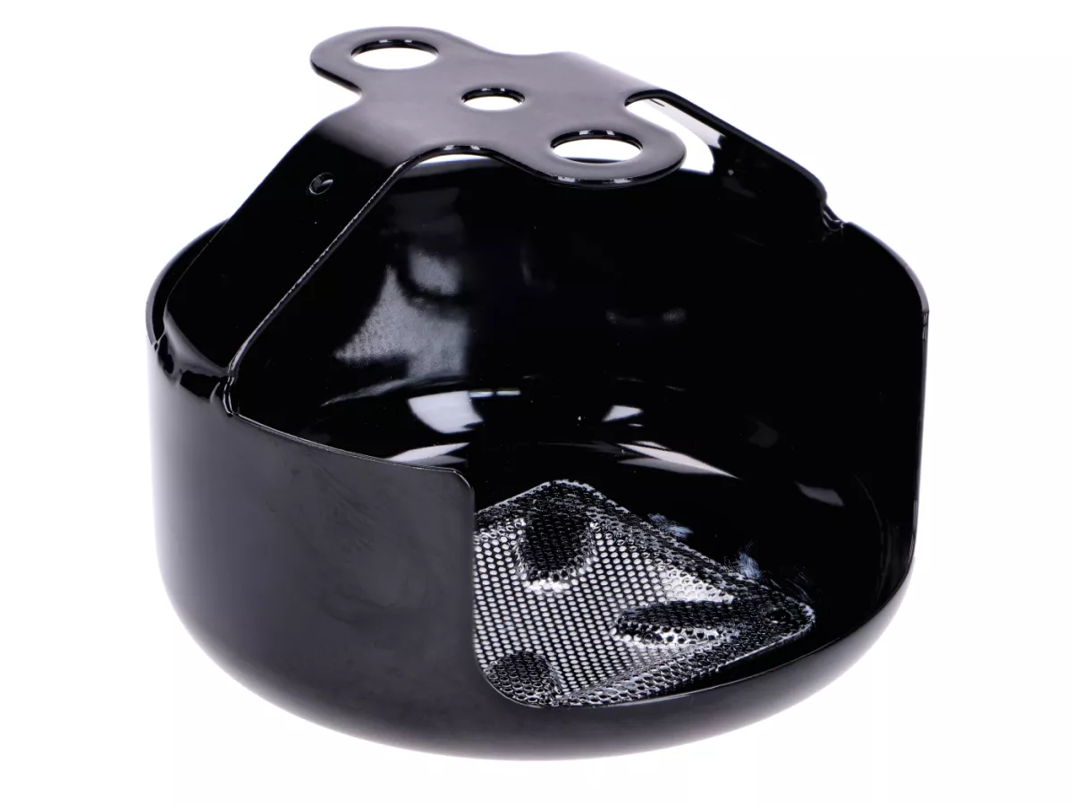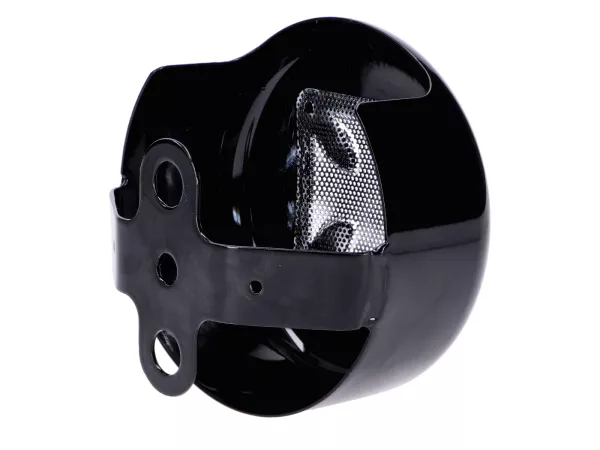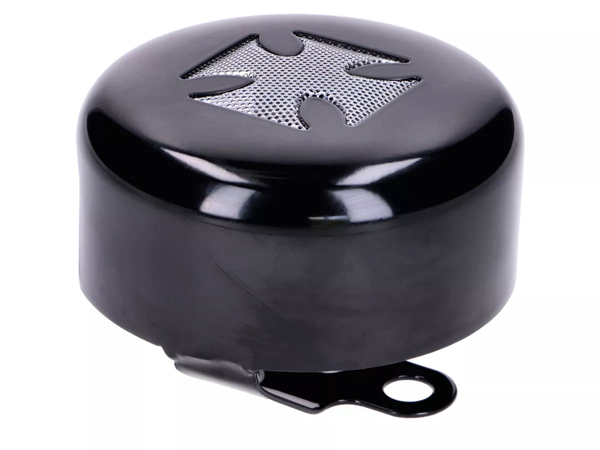Hochwertige Hupenabdeckung Iron Cross von Drag Specialties in Schwarz mit Chromgitter passend für Harley Davidson ab 91, Big Twin und XL Modelle mit Hornbefestigung zwischen den Zylindern.