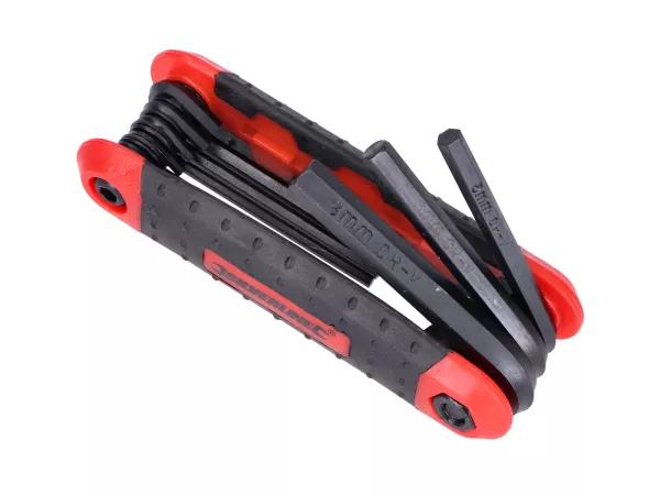 Sehr praktisches Klappwerkzeug mit 8 Stück Profi-Innensechskantschlüssel in verschiedenen metrischen Größen.