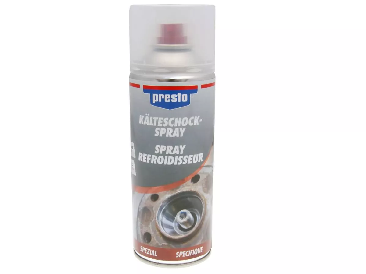 Presto Kälteschock-Spray ist ein hochwirksames Hilfsmittel zum Lösen festgerosteter oder gepresster Verbindungen z. B. Schrauben, Muttern, Bolzen, Kurbelwellen. Spezielle Inhaltsstoffe erzeugen auf dem verrosteten Werkstück einen kurzfristigen "Kälteschock" (-50°C), der eine Schrumpfung bewirkt. Auch zur Vermeidung von Wärmeschäden bei Lötarbeiten. Oder zum Abkühlen von Bauteilen bei Schrumpfverbindungen wie beispielsweise Lagersitzen.