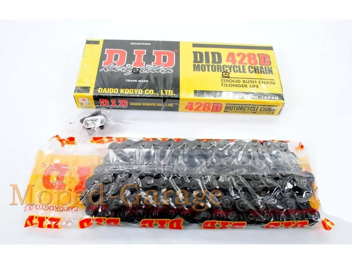 DID Kette mit 114 Gliedern, passend für Suzuki TS 80 ER Baujahr 81 bis 82 und andere Modelle. Top Qualität vom Erstausrüster, inklusive Kettenschloss.