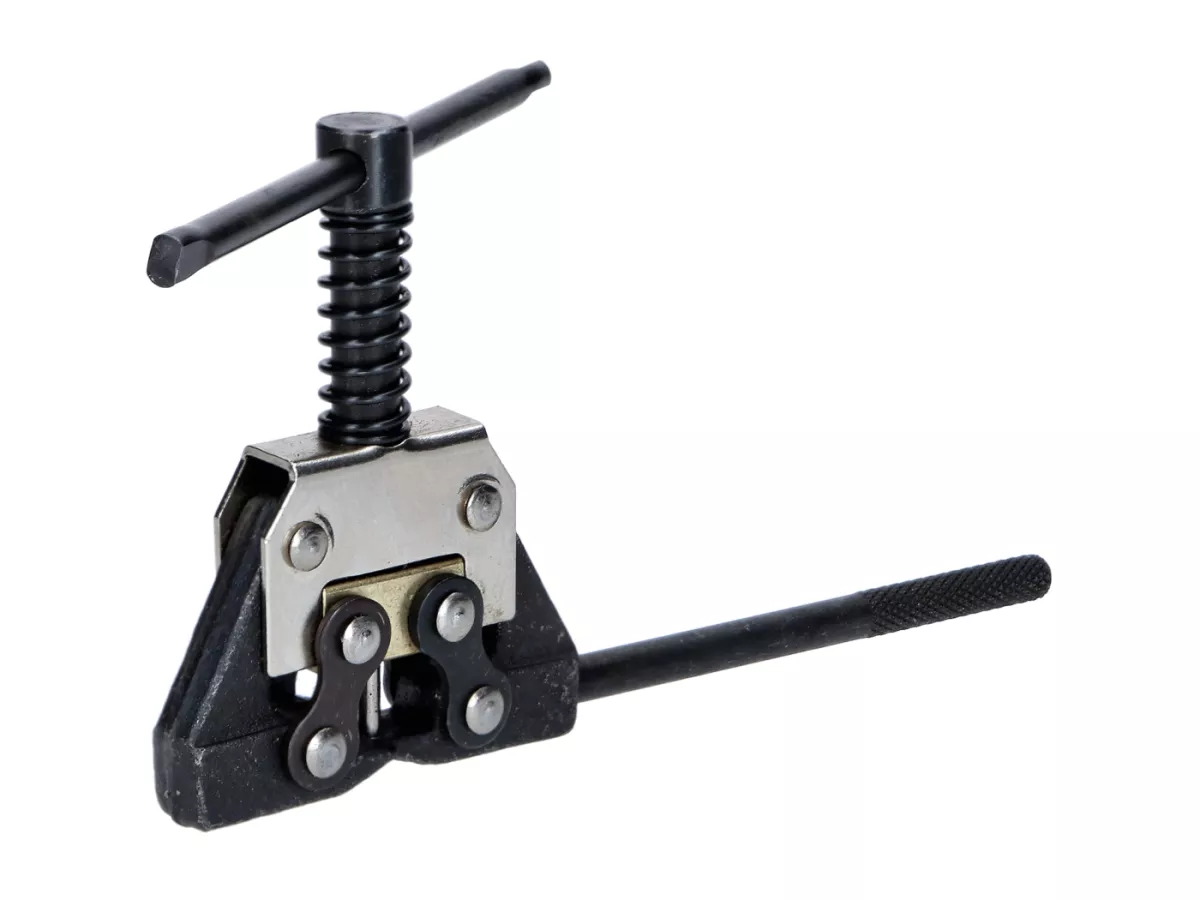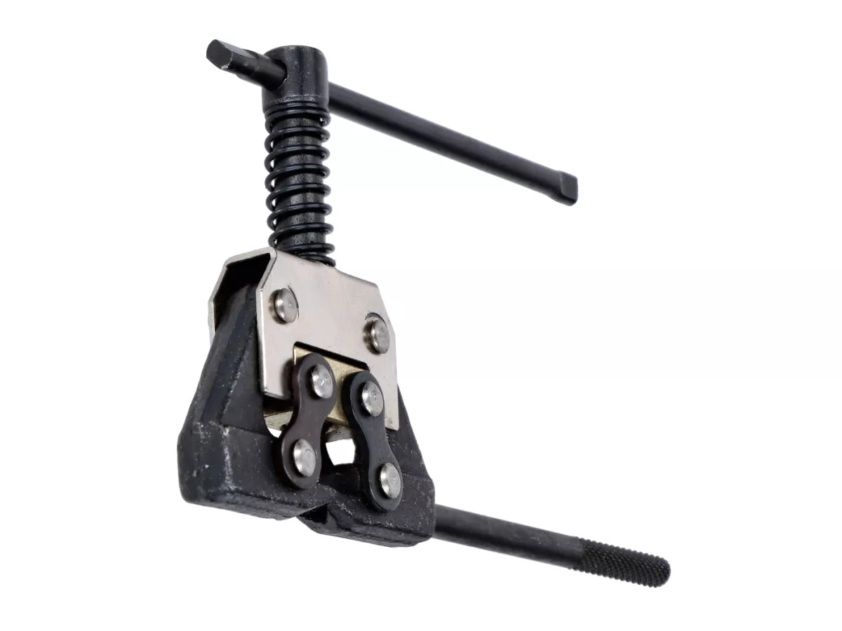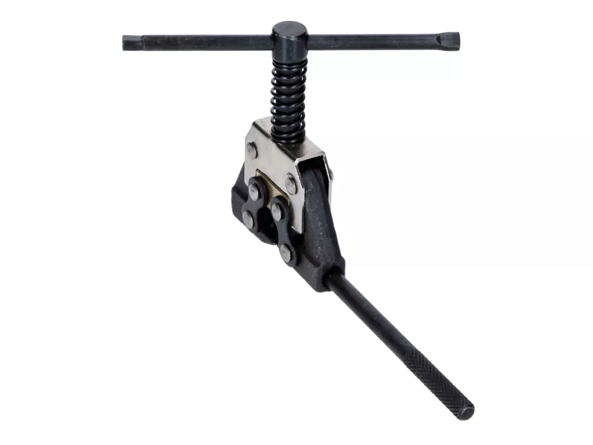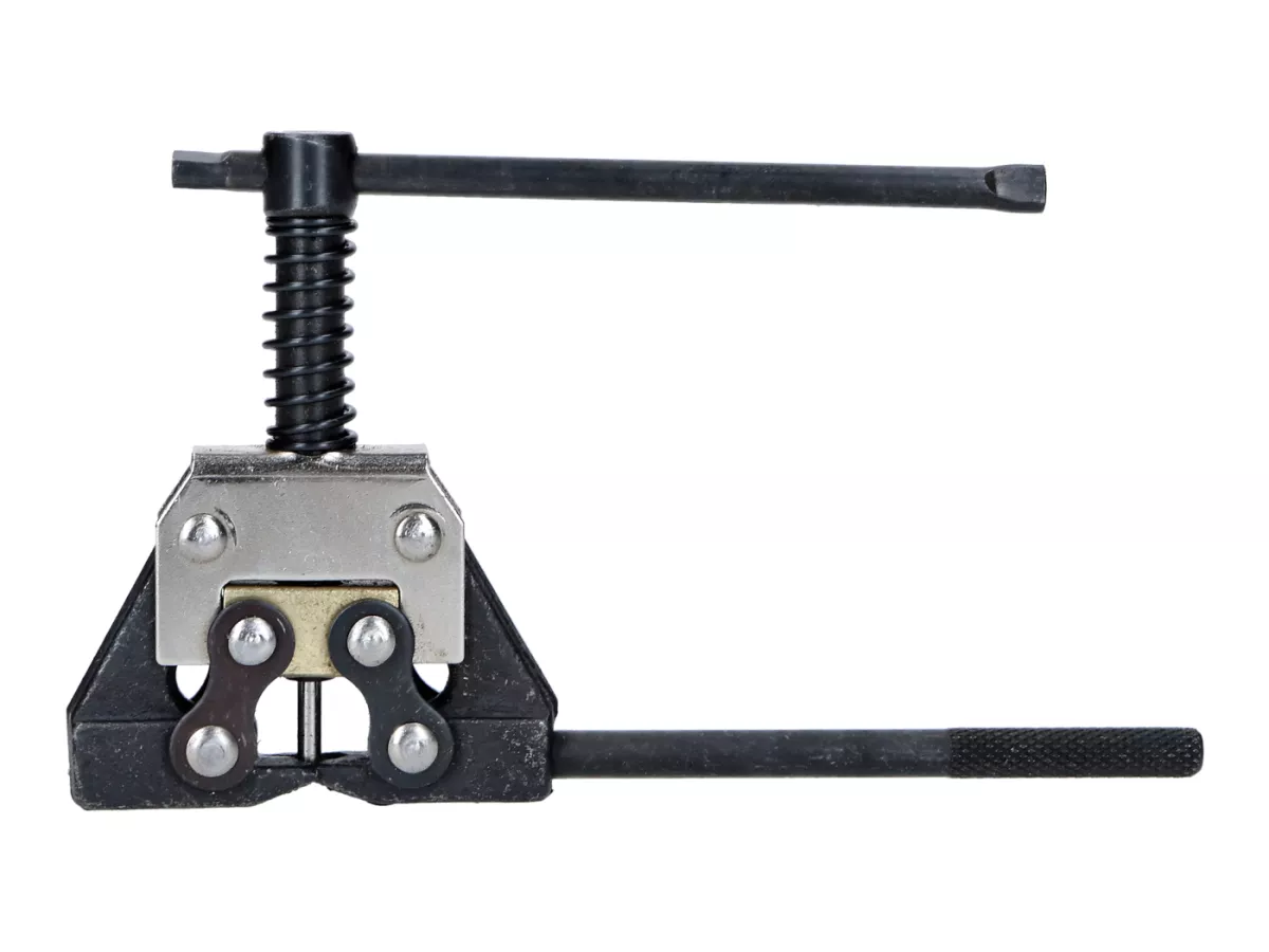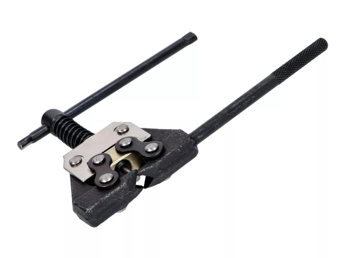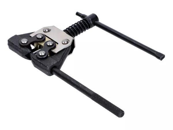 Universales Werkzeug zum Kettentrennen. So wird das Kürzen von Ketten zum Kinderspiel. Oftmals sind Ketten vom Hersteller ab Werk vernietet. Mit diesem Werkzeug lassen sich die Nietschlösser mühelos wieder öffnen. Sollte in keiner gut sortierten Werkzeugkiste fehlen.Auch bei Ketten mit Clipschlössern kann man nun ohne großen Aufwand die Übersetzung ändern, was ein Kürzen bzw. Verlängern der Kette voraussetzt. Lästiges zerflexen der Kette gehört somit der Vergangenheit an. Der Spannbereich deckt die Kettengrößen von 415 bis 428 ab. Damit ist das Werkzeug für jedes Mokick, Moped, kleinere Quad und ATV und Motorräder bis 428er Kettengröße geeignet.