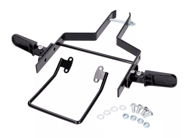 Kindersitz für kleine Copiloten. Zum Nachrüsten passend für Simson Moped / Mokick S50, S51, S70. Das Fußteil wird unter dem Tank am Hauptrahmen montiert. Der Haltegriff wird an den Lenkerklemmen befestigt. So sitzen die kleinen Beifahrer vor dem Fahrer sicher im Blick.