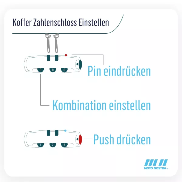 Der Code des Zahlenschlosses ist sehr einfach selbst einstellbar. Dazu einfach den Codierkonopf drücken, gewünschten Zahlencode einstellen und mit dem Entriegelungshebel bestätigen.