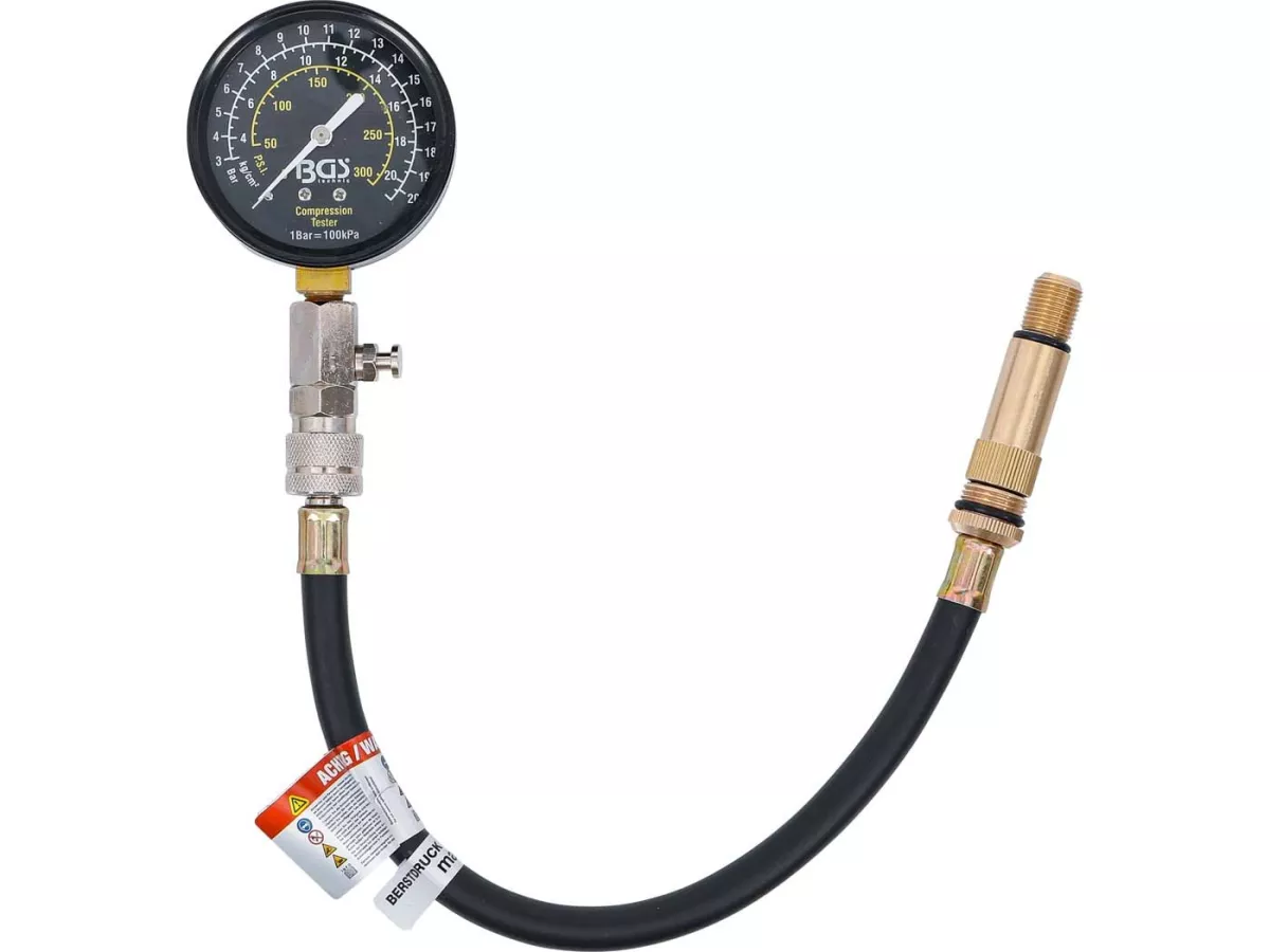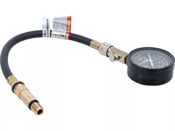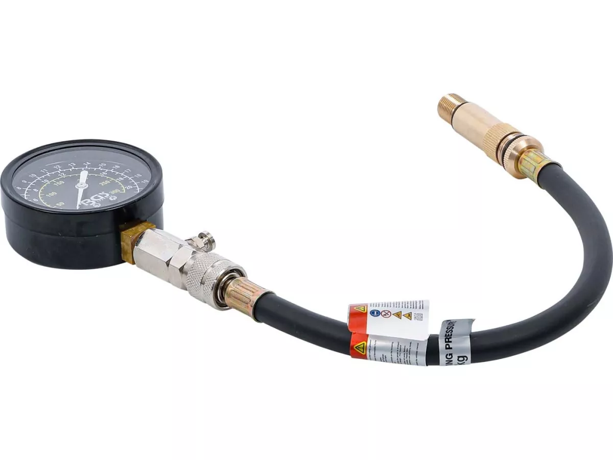 Dieser Kompressionstester eignet sich universell für Motorräder und Pkw mit M14 oder M18 Zündkerzengewinde. Er verfügt über einen 300 mm langen, flexiblen Prüfschlauch und ein gut ablesbares Manometer (Durchmesser 70mm, Toleranz ±3%) mit einem Messbereich von 0 bis 21 bar (300 PSI).