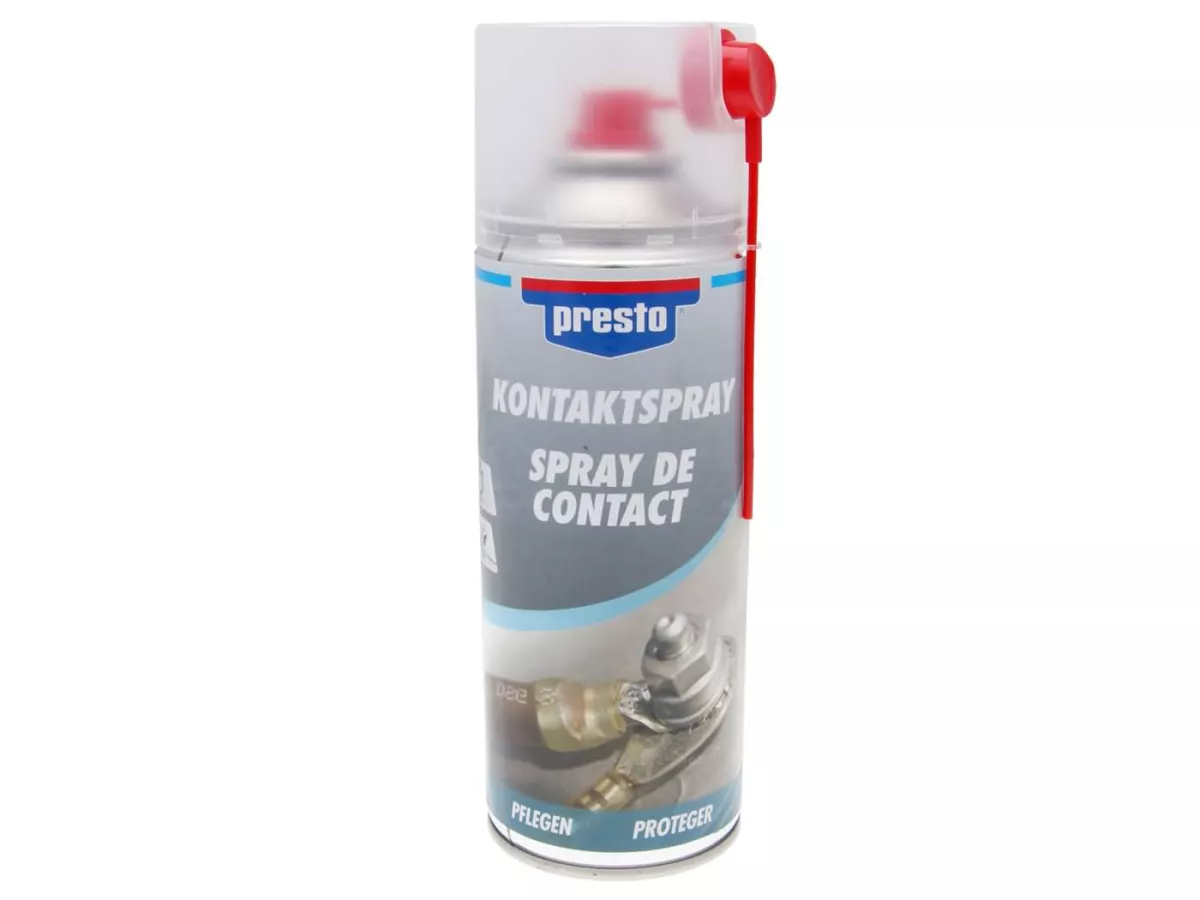 Kontaktwiderstände, Kriechströme und Spannungsverluste bei Elektroverbindungen werden mit Presto Kontakt-Spray zuverlässig beseitigt. Der reibungslose Stromdurchfluss ist gewährleistet. Verdrängt Schwitzwasser in Steckverbindungen.