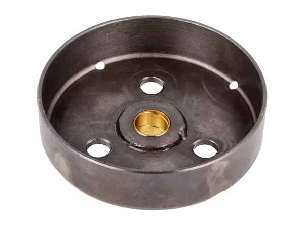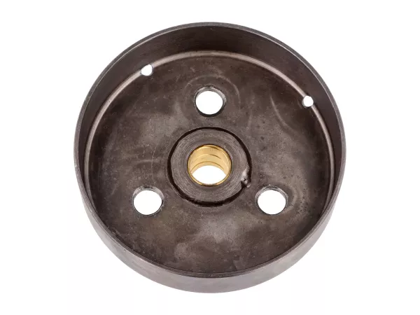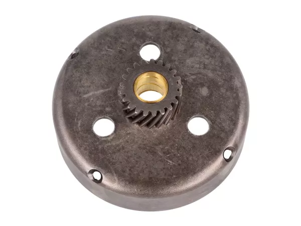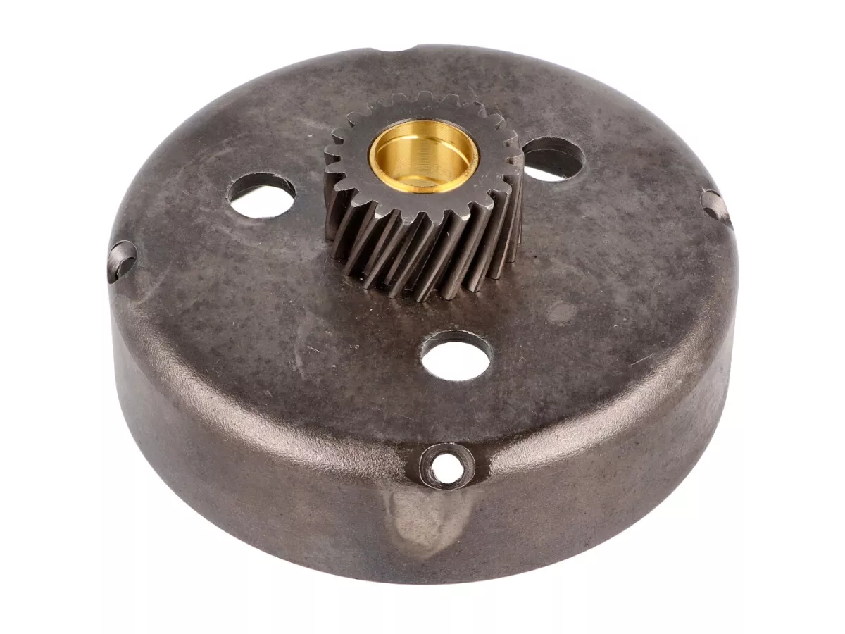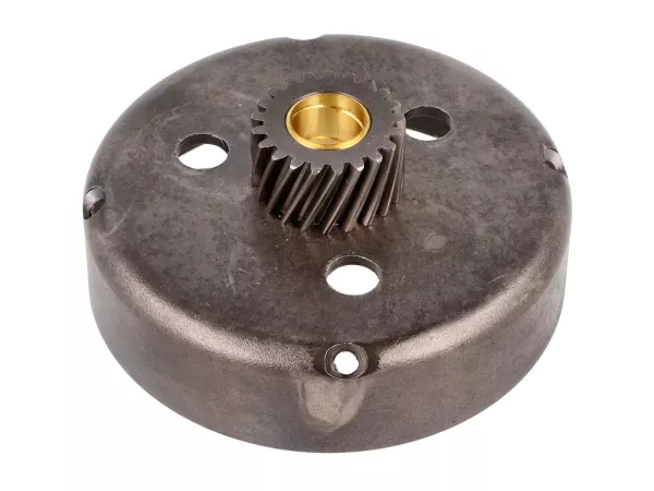Kupplungskorb von Fast-Arrow mit einem Ritzel mit 21 Zähnen, schräg verzahnt, passend für Puch Maxi E50 mit einem Primärgetriebe mit 106 Zähnen und Kickstarter. Inklusive eingepresster Gleitbuchse aus Messing.