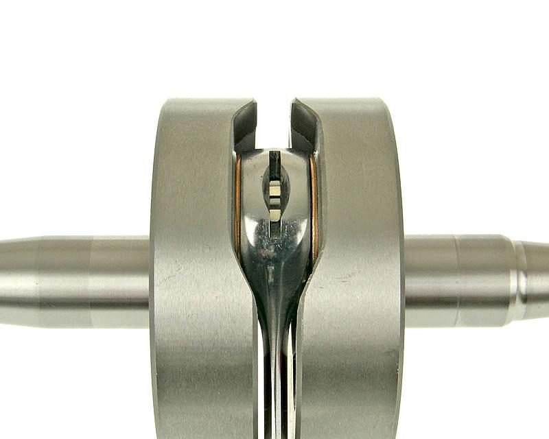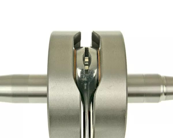 Die komplett geschmiedete Welle wird aus hochlegiertem 18NiCrMo5 Stahl gefertigt und mit einem speziellem Hitzeverfahren gehärtet. Die Vollwangenbauweise ermöglicht eine höhere Vorverdichtung und sorgt damit für eine bessere Zylinderfüllung. Bei der Fertigung des Pleuels wurde zusätzlich ein besonderes Augenmerk auf die Belastbarkeit gelegt. Das Pleuel ist komplett geschmiedet und zur Verfestigung der Struktur oberflächenpoliert. Es wird dem gleichen Härteverfahren wie die Kurbelwelle unterzogen, und garantiert damit absolut geringen Verschleiss im Bereich der Lagerstellen. Die Silbernadellager sorgen für exzellente Lagerung und sind drehzahlfest bis über 16.000 U/min. Eine perfekte, dynamisch ausgewuchtete Kurbelwelle für stärkste Belastungen und optimale Performance in High End Motoren.