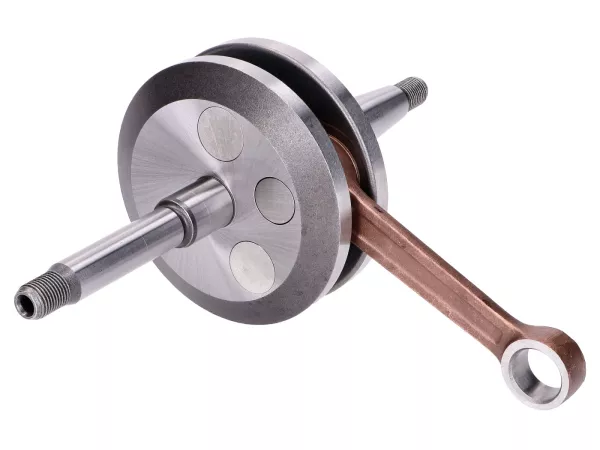 Die geschliffenen Kurbelwangen sind fein gewuchtet. Hierzu werden zur Gewichtsreduzierung 2 Aluminiumeinsätze verwendet. Ein HD-Nadellager für den Kolbenbolzen wird mitgeliefert. Top Racing Kurbelwellen werden vom portugiesischen Qualitätshersteller Jasil hergestellt.