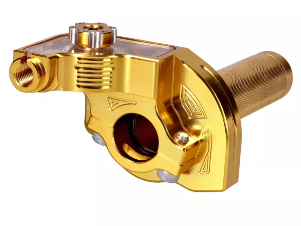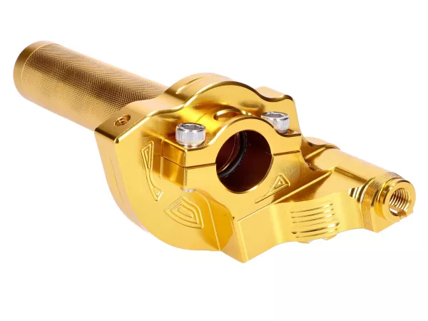 Komplett CNC gefräster Kurzhub-Gasgriff, gelb eloxiert. Passend für alle Lenker mit 22mm Durchmesser.