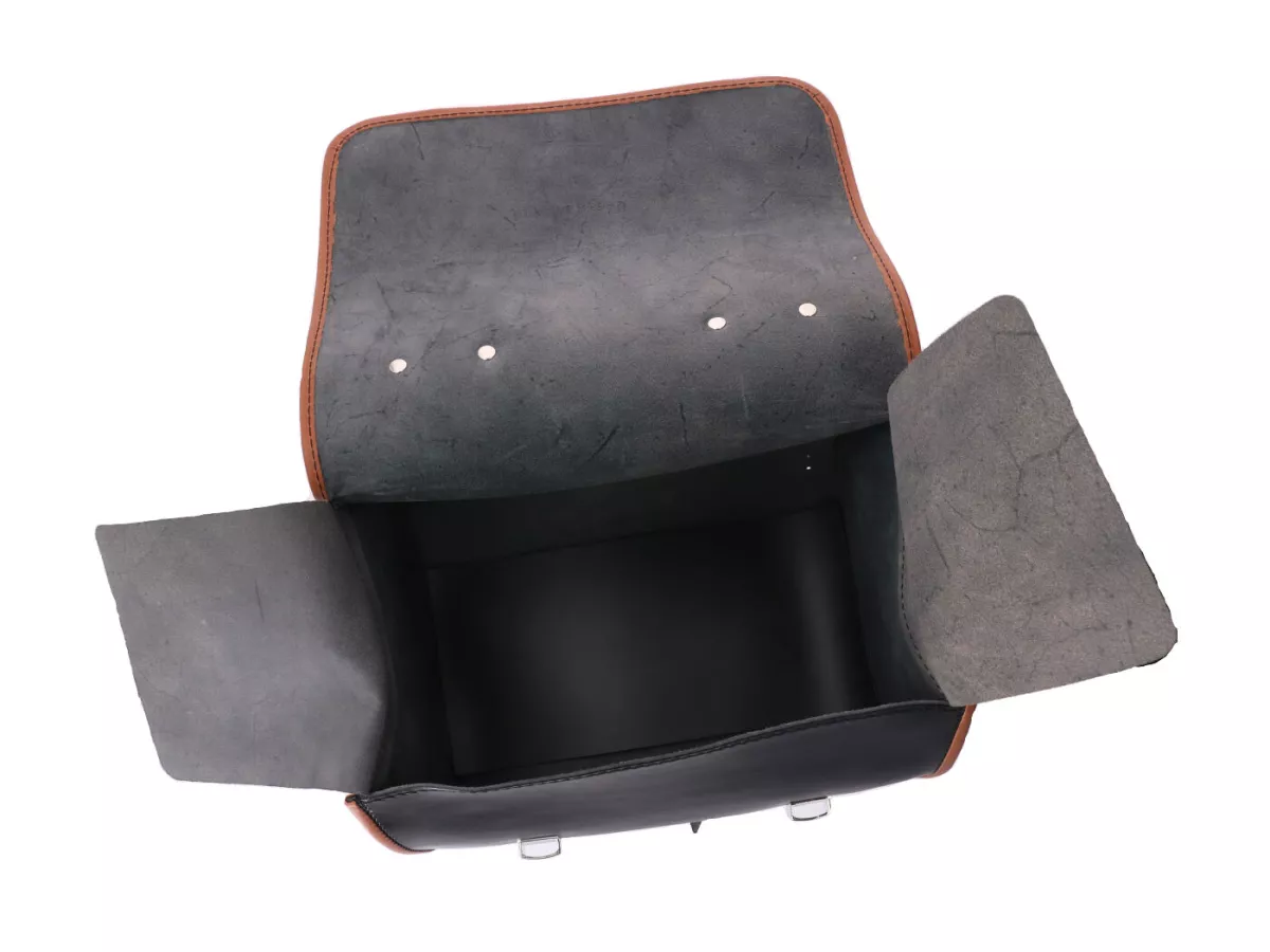 Perfekte, hochwertige und formstabile Verarbeitung aus ca. 5mm starkem Echtleder. Die Montage erfolgt am Gepäckträger bzw. an der Gepäckbrücke. Passend für alle Vespa Modelle.