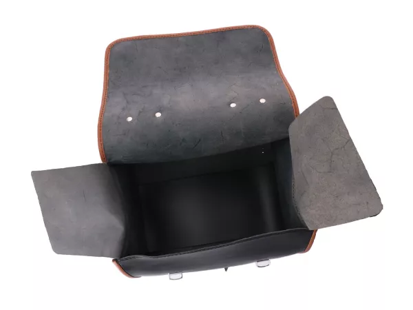 Superschöne Vespa Gepäcktasche / Satteltasche aus Echtleder mit Tragegriff. Schwarz mit braunen Applikationen und Vespa Schriftzug. Originales Vespa Zubehörteil.