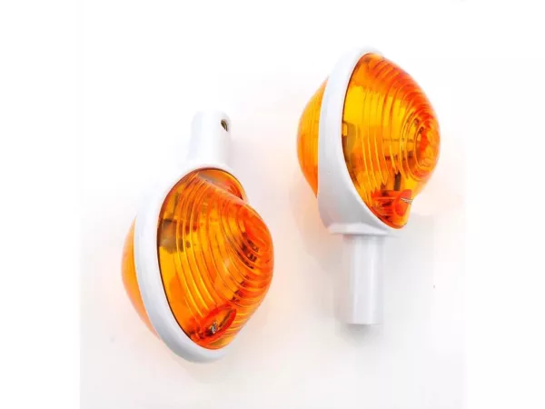 Paar Lenkerblinker, alte Version, ohne Leuchtmittel, Farbe Beige Weiß. Passend für Simson Mopeds wie Schwalbe KR 51, Sperber, Habicht, Star. Auch für andere Mopeds geeignet. Passende Leuchtmittel: Soffitte Art. Nr. 00052141 oder 52159.