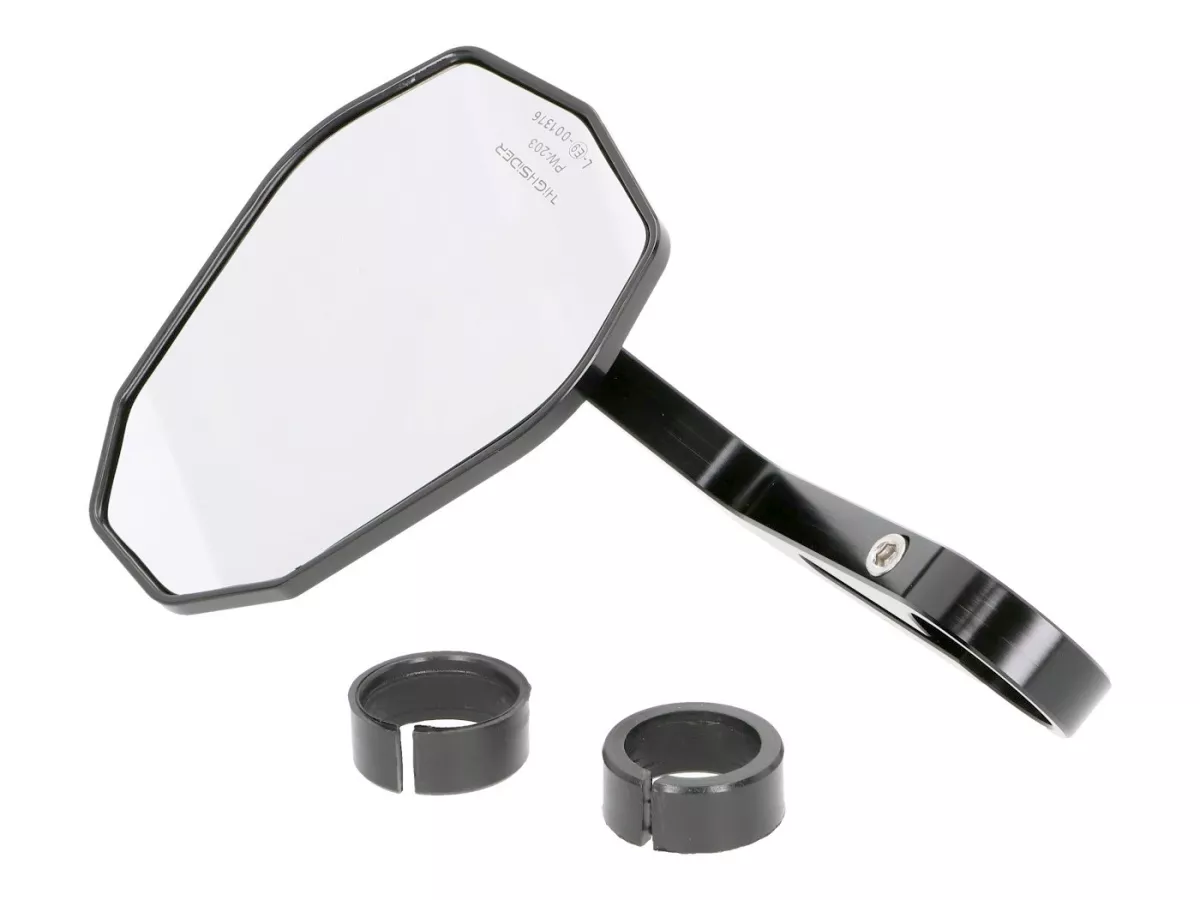 Schwarz eloxierter Aluminium-Lenkerendenspiegel von Highsider. Dank der beiden Adapter kann der Spiegel am zölligen (25,4mm) oder metrischen (22mm) Lenker montiert werden.