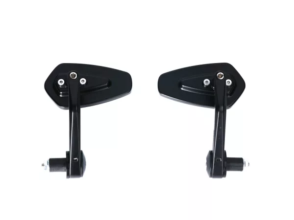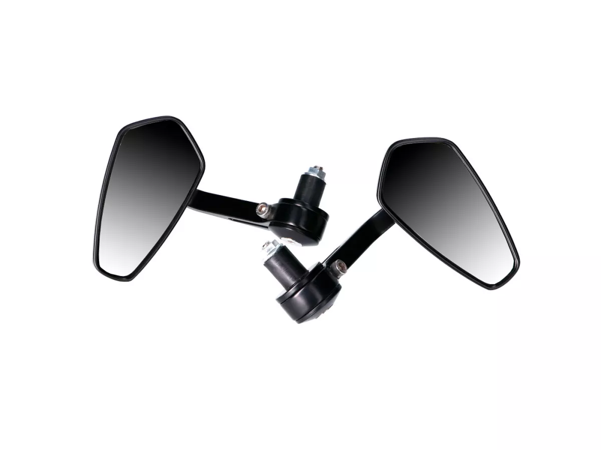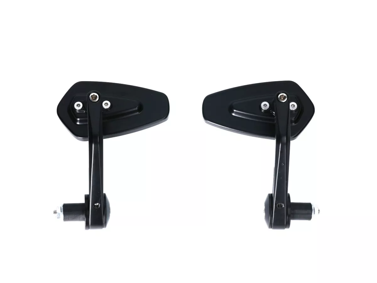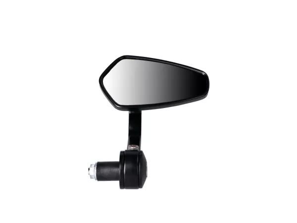 Spiegel aus Aluminium, CNC-gefräst und schwarz beschichtet für das linke und rechte Lenkerende. Die Spiegel haben eine konische Gummi-Klemmung und sind für Lenkerenden mit 18mm Innenmaß geeignet. Die Montage der Spiegel ist sowohl stehend als auch kopfüber möglich.