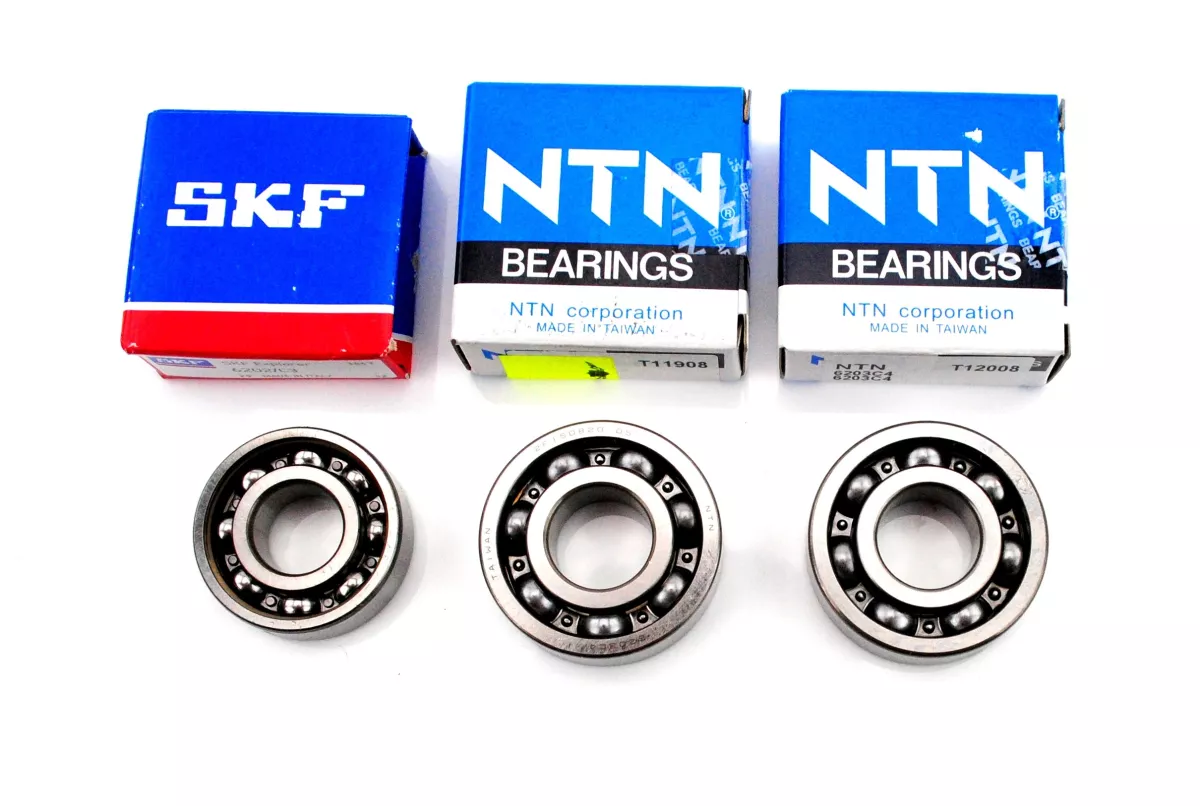 Ein 3-teiliger Motorlager Satz in Top Qualität von SKF und NTN bestehend aus: 2 x NTN Kurbelwellen Lager C4, 1 x SKF Vorgelege Welle Lager C3, passend bei Hercules Prima Presto, Prima Pronto, Prima GT, Prima GX, Supra 4 GP, MK 2 mit Sachs Motor Typ 506. Empfohlen werden Lager von SKF, NTN, NSK und FAG aufgrund ihrer hohen Qualität für Motor Revisionen.
