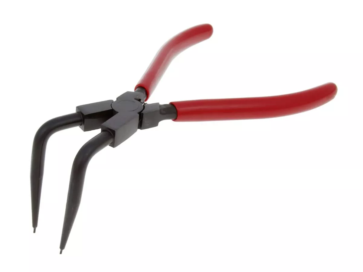 Nutenringzange von Buzzetti. Die Zange ist um 90° abgewinkelt und nach unten verlängert, um besser an tief sitzende Sicherungsringe zu gelangen.