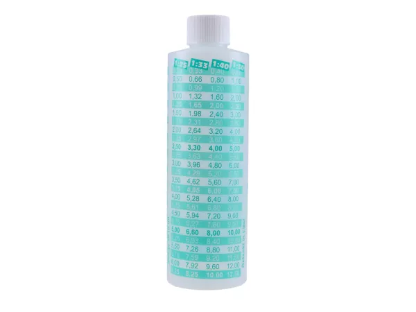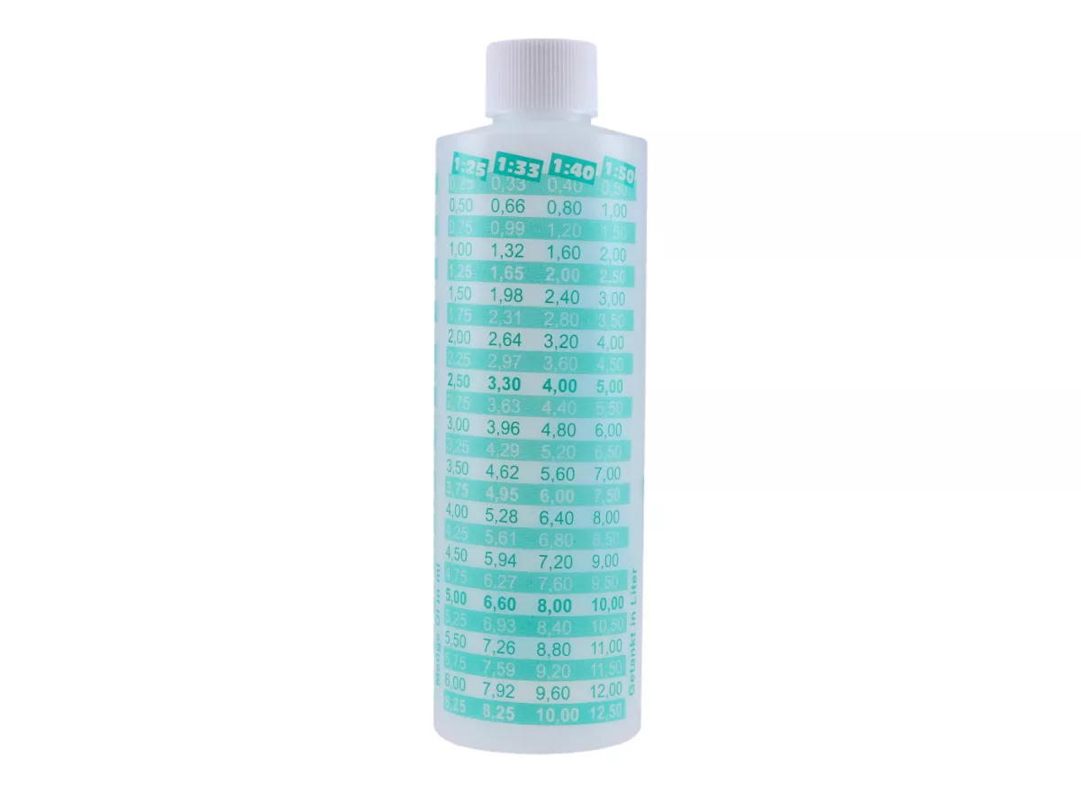 Die Flasche fasst 250ml 2-Takt Mischöl eurer Wahl und ist mit den Mischverhältnissen 1:25, 1:33, 1:40: 1:50 bedruckt. Je nach Mischverhältnis sind die Ölmengen für 0,25 Liter bis 12 Liter Benzin abgebildet, natürlich sinnhaft "aufsteigend" trotz abnehmender Ölmenge da die Skala die ausgegossene Menge Öl anzeigt.