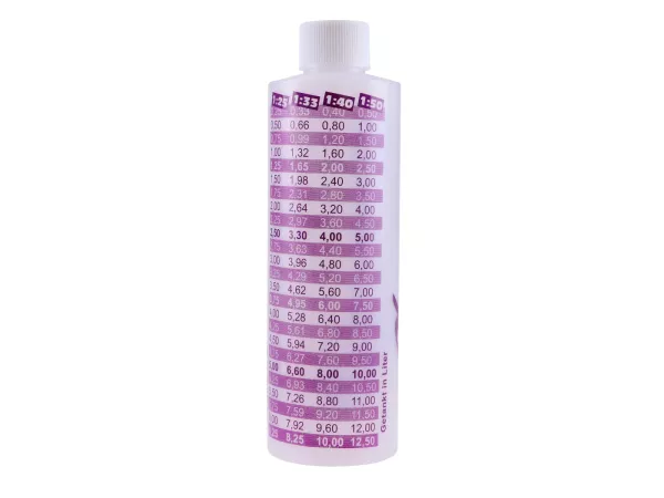 Die Flasche fasst 250ml 2-Takt Mischöl eurer Wahl und ist mit den Mischverhältnissen 1:25, 1:33, 1:40: 1:50 bedruckt. Je nach Mischverhältnis sind die Ölmengen für 0,25 Liter bis 12 Liter Benzin abgebildet, natürlich sinnhaft "aufsteigend" trotz abnehmender Ölmenge da die Skala die ausgegossene Menge Öl anzeigt.